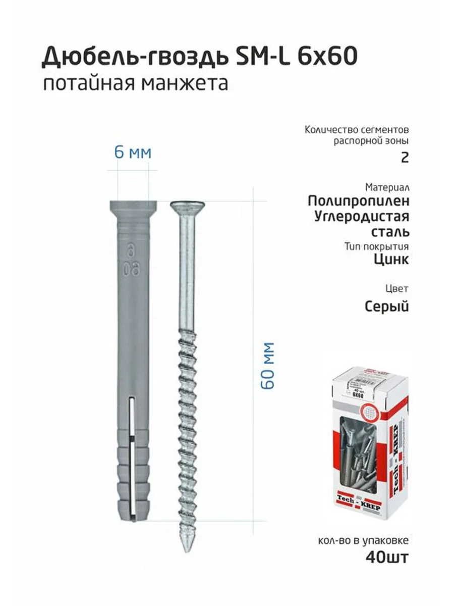 Дюбель-гвоздь 6х60 с потайной манжетой полипропилен (уп.40шт) коробка Tech-Krep 112712