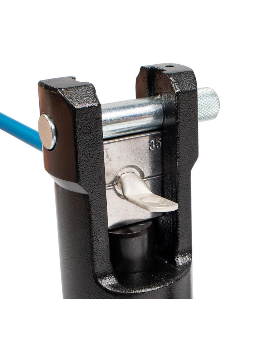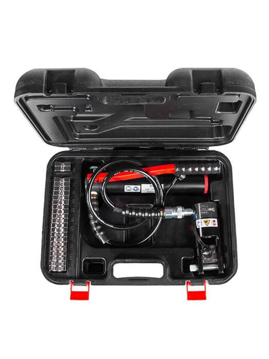 • Предназначены для опрессовки медных и алюминиевых неизолированных трубчатых наконечников • В комплекте: • стальная гидравлическая голова • гидравлическая помпа ПМР-7003 • рукав высокого давления длиной 1.3 м • набор из 12 сменных матриц • ремкомплект (уплотнительные кольца) • прочный пластиковый кейс • Диапазон сечений: • медные наконечники 10–300 мм2 • алюминиевые наконечники 10–300 мм2 • Ширина матриц: 10 мм • Максимальное усилие: 12 т • Присоединительная резьба: K 3/8" «розетка» • Вес комплекта/инструмента: 10.00/6.10 кг • Габариты кейса: 480х350х150 мм • Дополнительные аксессуары: наборы матриц НМ-300 ТМ, НМ-300 ТМЛс, НМ-300 ТА, НМ-300 DIN, НМ-300 ПМ, НМ-300 СОАС, НМ-300 НШВИ, НМ-300 С, НМ-300 СИП
