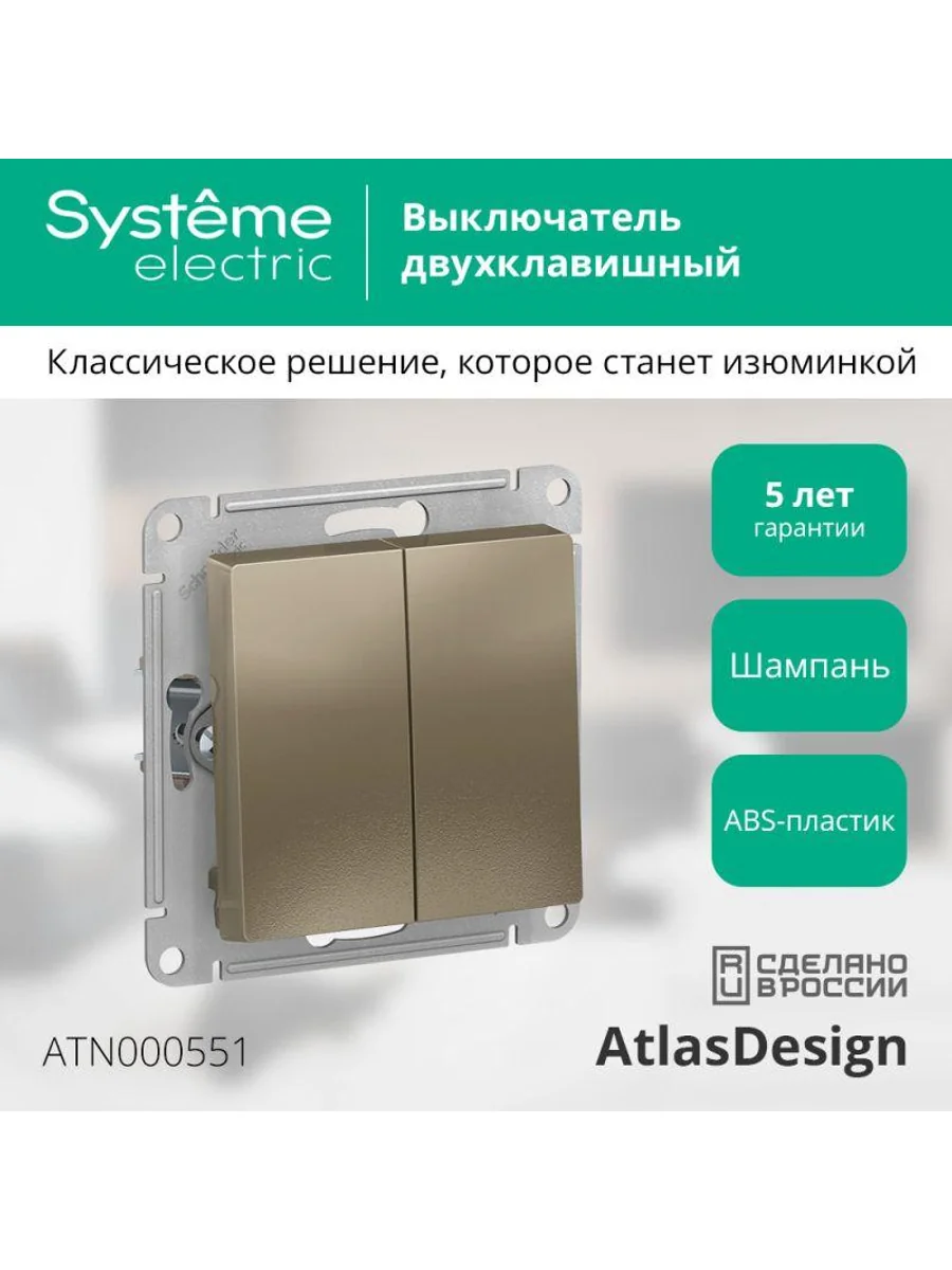Механизм выключателя 2-клавишного Systeme Electric (ранее Schneider Electric) серии AtlasDesign в цвете шампань подходит для сетей 250 В, на ток 10 А. Двухклавишный выключатель позволяет управлять двумя источниками света с одной точки. Лицевые детали из качественного ABS-пластика, устойчивого к царапинам и УФ-излучению. Усиленные прямые монтажные лапки для лучшей фиксации механизма в монтажной коробке.
