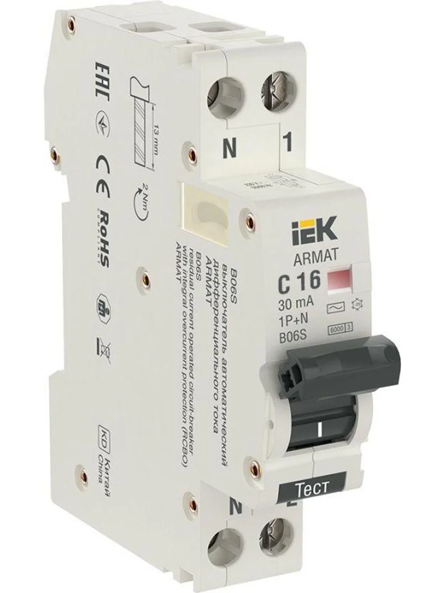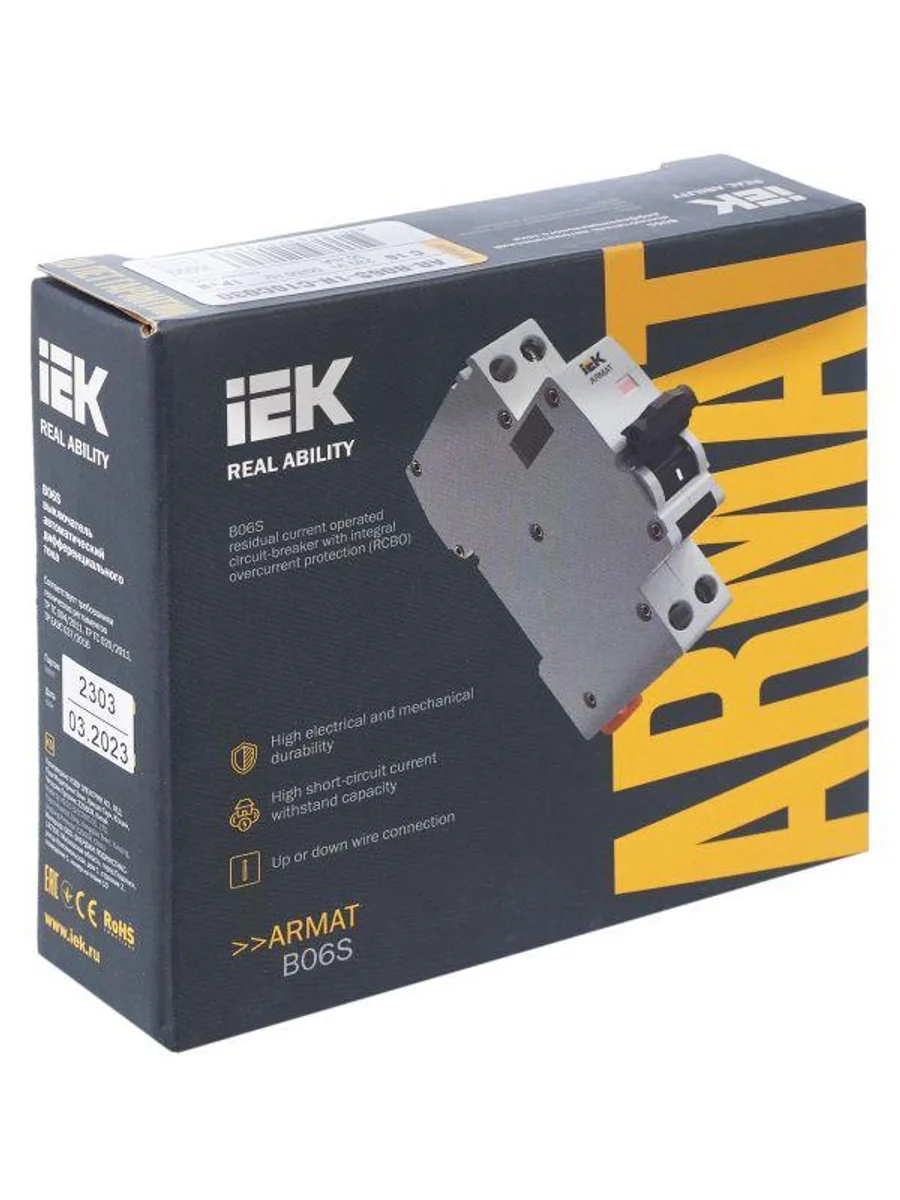 Автоматические выключатели дифференциального тока (АВДТ) ARMAT серии B06S могут осуществляют функции защиты от токов перегрузки и короткого замыкания и защиты человека от токов замыкания на землю. Модельный ряд включает в себя устройства с номинальными токами от 6 до 32 А, характеристиками срабатывания по сверхтоку B и C, типами защит AC и A с номинальным дифференциальным током отключения 30 мА. Номинальная отключающая способность АВДТ ARMAT серии B06S составляет 6 кА.