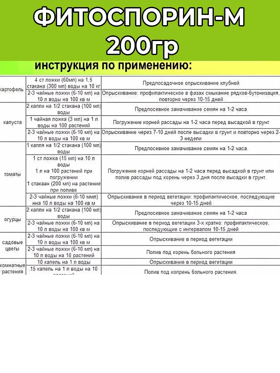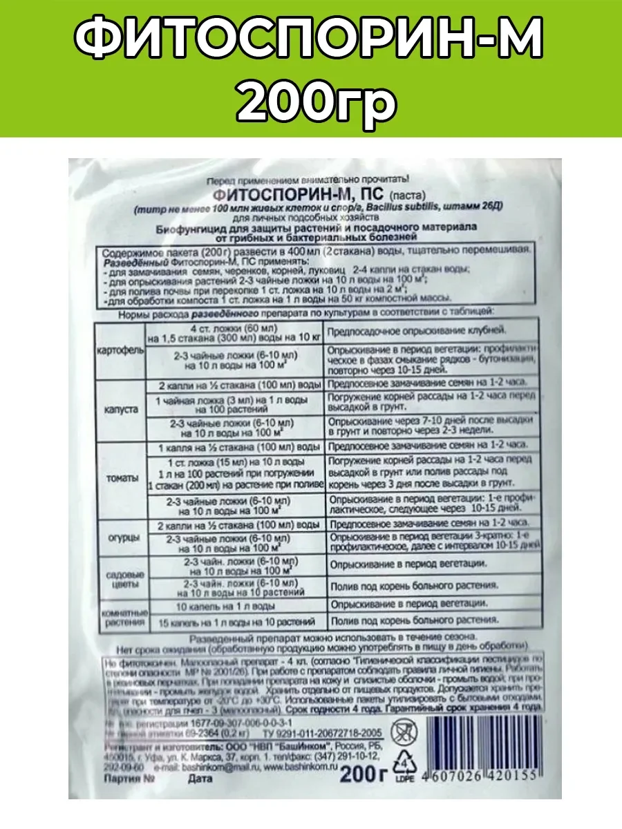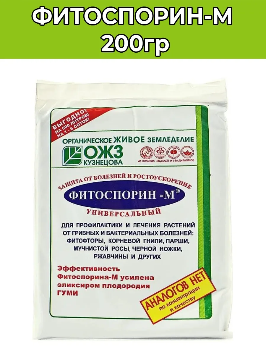 Удобрение Фитоспорин-М универсал паста 200г 2 пакетика Фитоспорин эффективен против широкого спектра грибных и бактериальных заболеваний, в том числе против парши, увядания, черной ножки, фитофтороза, плесневения семян, корневых гнилей, гнилей всходов, мучнистой росы, бурой ржавчины, пыльной головни, пузырчатой головни, альтернариоза, ризоктониоза, фузариоза, септориоза и многих других.Предназначен для защиты таких культур: картофель, капуста, томаты, огурцы, садовые цветы, комнатные растения и другие культуры.