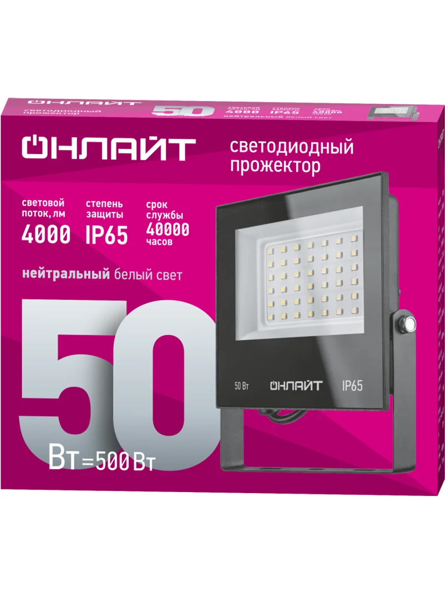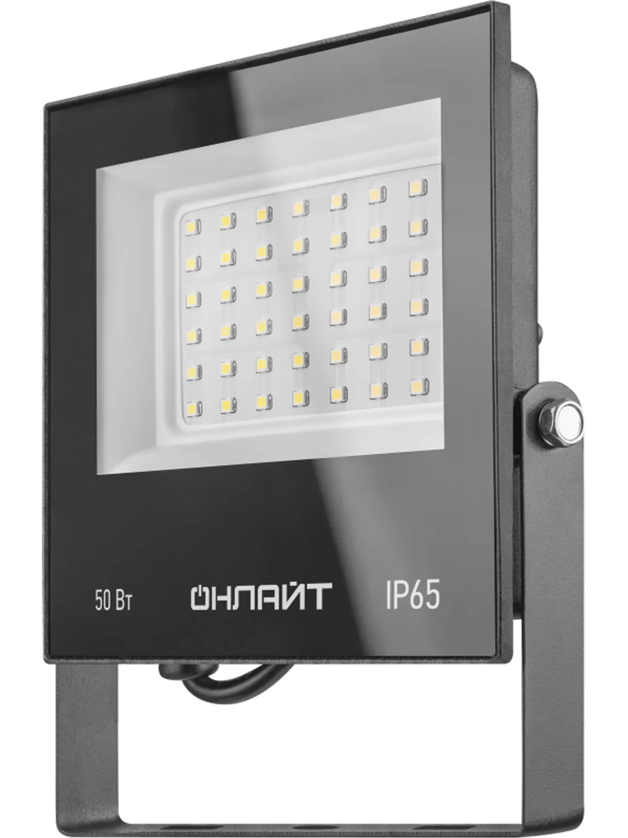 Прожектор 71 659 OFL-50-4K-BL-IP65-LED LED 50Вт IP65 4000К ОНЛАЙТ 19199 является аналогом галогенного прожектора мощностью 500 Вт. Корпус и рефлектор изготовлены из алюминиевого сплава. Рекомендуется к применению как средство наружного освещения (дворов и придомовых территорий, билбордов, стендов), так и внутреннего освещения, в помещении, для освещения витрин, залов, галерей, складов, гаражей.
