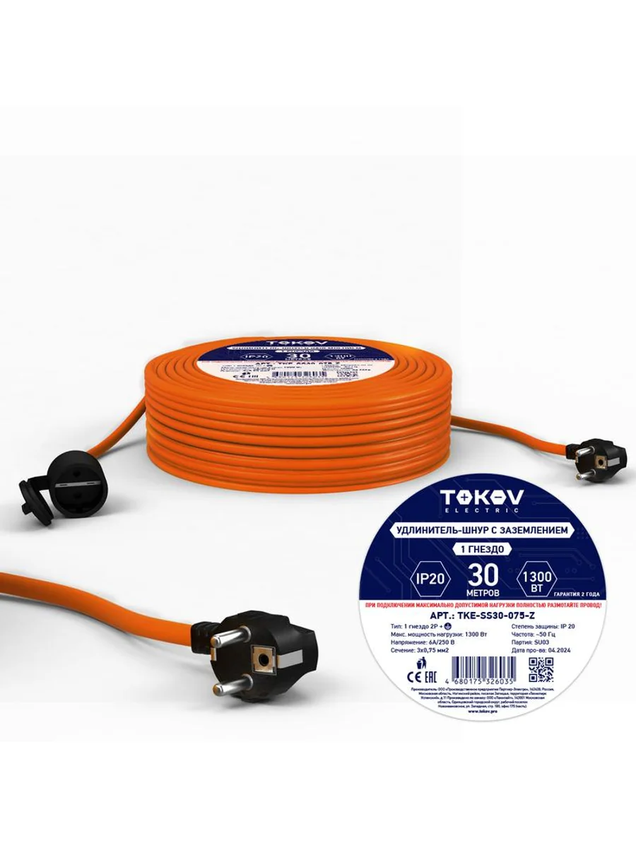 Удлинитель-шнур 1х30м с заземл. 6А IP20 3х0.75 TOKOV ELECTRIC TKE-SS30-075-Z - купить в KeepBuilding | KeepBuilding