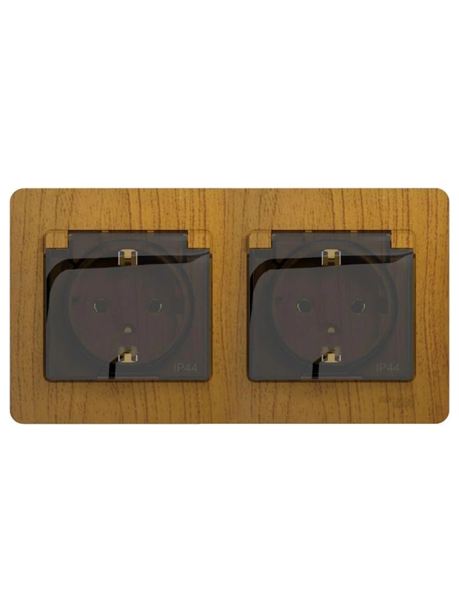 Розетка Systeme Electric (ранее Schneider Electric) серии Glossa (в сборе, цвет дерево дуб) двойная с заземлением, шторками и крышкой подходит для сетей 250 В, на ток 16 А. - Изделие со степенью защиты IP44 обеспечит безопасность использования в ванной и на кухне. - Заземляющий контакт обеспечивает дополнительную защиту от удара электрическим током. При наличии заземления электрический потенциал уходит в землю, защищая человека. - Выполнен из материала PС+ASA, стойкого к УФ-излучению и появлению царапин.