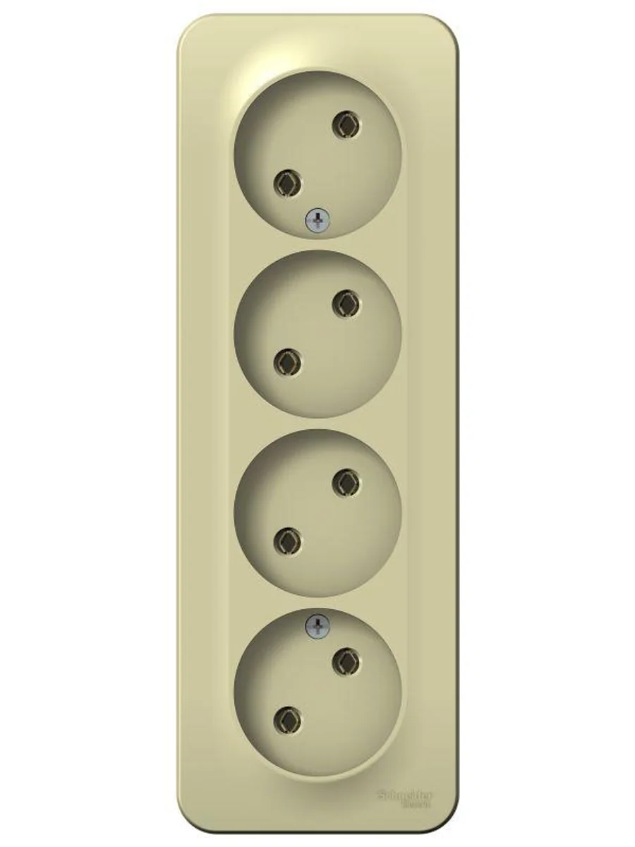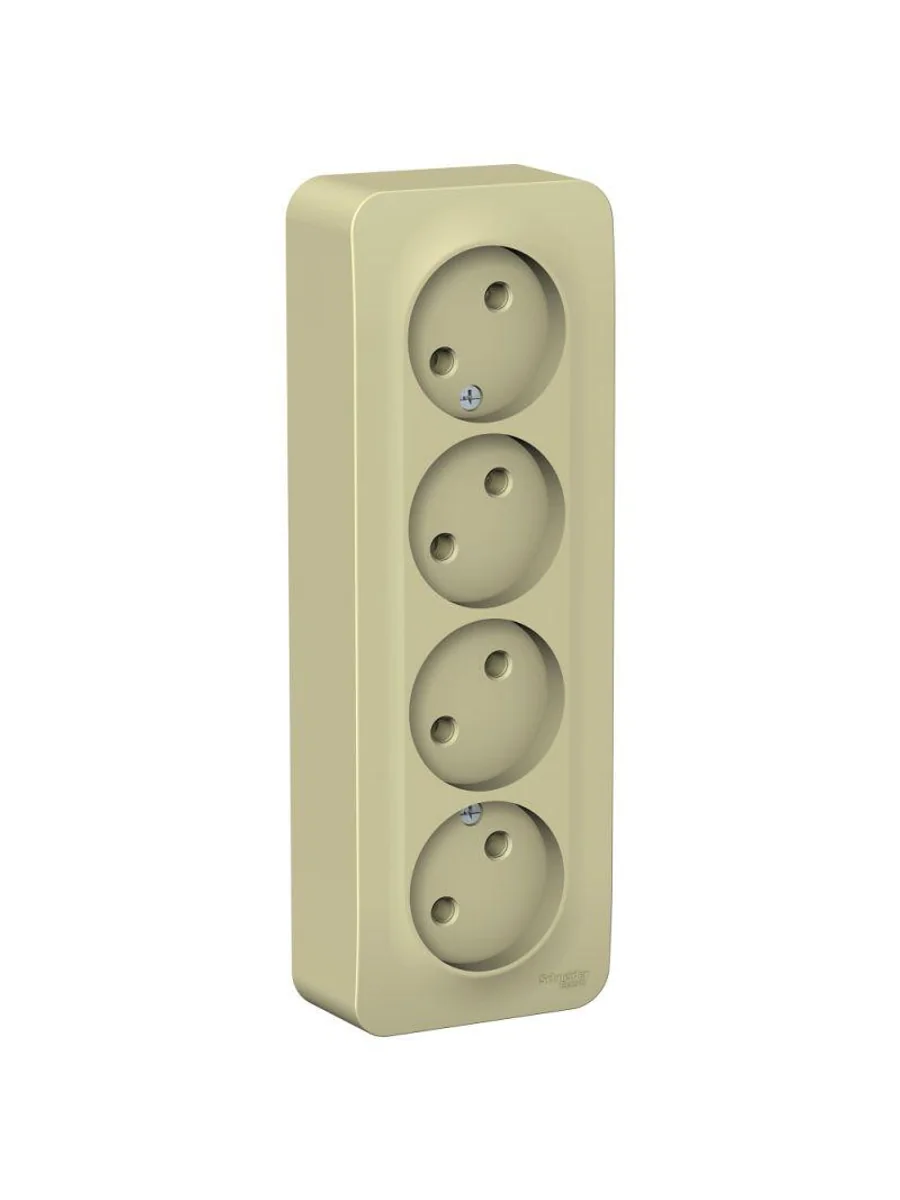 Розетка Systeme Electric (ранее Schneider Electric) BLANCA (открытой установки, цвет бежевый) четырёхместная без заземления и шторок, с изолирующей пластиной подходит для сетей 250 В, на ток 16 А. Четкая маркировка клемм для безошибочного подключения. Входные отверстия расположены под углом 45 градусов, благодаря чему можно подключить несколько устройств: вилки и адаптеры не будут мешать друг другу. Корпус изделия выполнен из ABS-пластика.