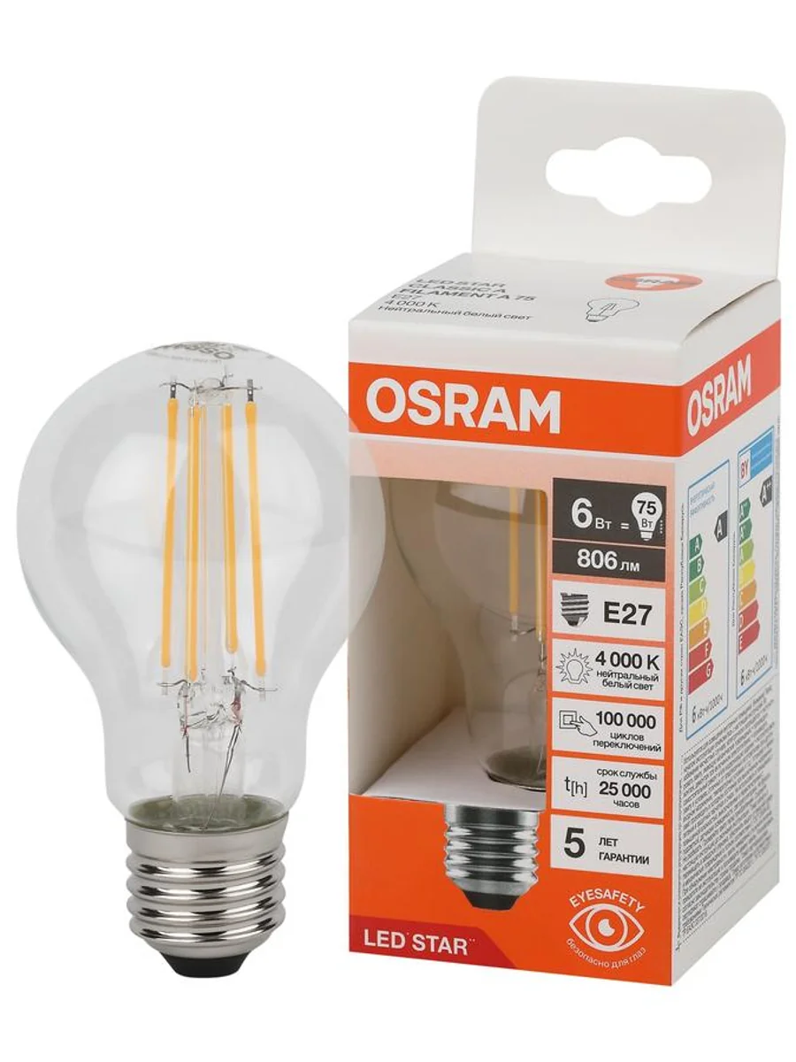 Светодиодные лампы OSRAM - разумная замена традиционным лампам накаливания или галогенным лампам. Светодиодные лампы OSRAM снижают затраты на освещение до 90% при сохранении привычного уровня освещенности. Эта лампа OSRAM серии LED Star выполнена в форме колбы A ("груша") с цоколем E27. Материал колбы - стекло, исполнение - прозрачное. Световой поток 806 люмен, что соответствует лампе накаливания на 75 Вт. Это филаментная лампа прекрасно выглядит, а потому идеально подходит для открытых светильников и декоративного освещения. Эта лампа излучает нейтральный белый свет, угол пучка - широкий. Качество света на высоте: низкие пульсации защищают глаза, а высокий индекс цветопередачи позволяет видеть мир в его истинном цвете. Кроме того, лампы OSRAM полностью безопасны для здоровья, поскольку в них нет опасных материалов по европейскому стандарту RoHS, а также они не производят вредных электромагнитных излучений, что подтверждено ЭМС (сертификат электромагнитной совместимости). Лампа проработает долго: срок службы - 25000 часов, 5 года гарантии. Светодиодные лампы OSRAM - умный выбор для здоровья семьи и кошелька!