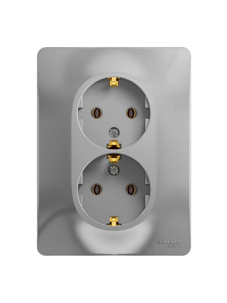 Розетка двойная Systeme Electric (ранее Schneider Electric) серии Glossa (в сборе, цвет алюминий) с заземлением, без шторок подходит для сетей 250 В, на ток 16 А. - Заземляющий контакт обеспечивает дополнительную защиту от удара электрическим током. При наличии заземления электрический потенциал уходит в землю, защищая человека. - Выполнен из материала PС+ASA, стойкого к УФ-излучению и появлению царапин. - Двойная розетка позволяет подключить два устройства в одном месте.