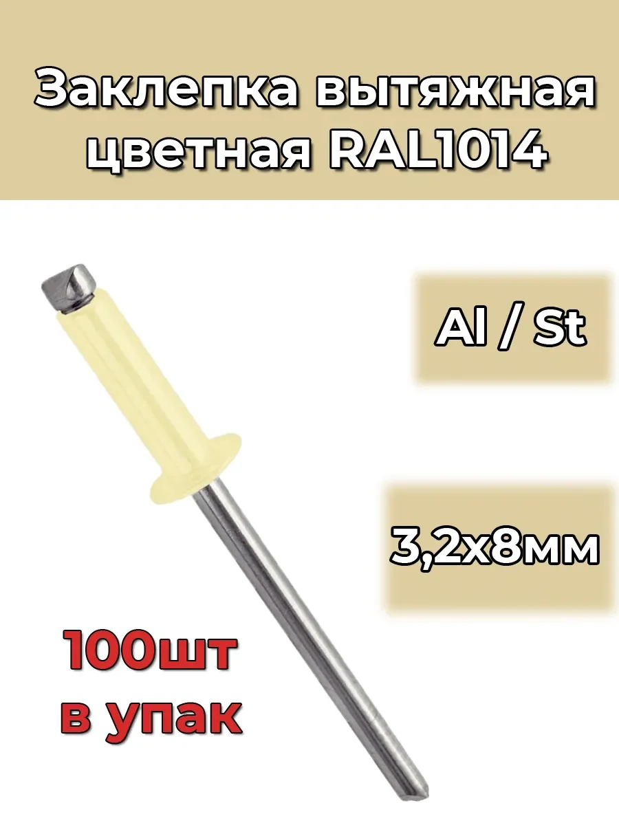 Заклепки вытяжные размером 3,2х8. В упаковке 100шт. Производитель: Норманд Фастернерс. Цвет: RAL 1014. Материал: оцинкованная сталь и алюминий. Толщина соединяемых материалов: 3,5-5мм Диаметр бортика: 6,2мм Диаметр отверстия: 3,3-3,4мм