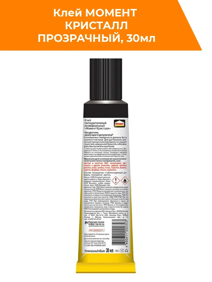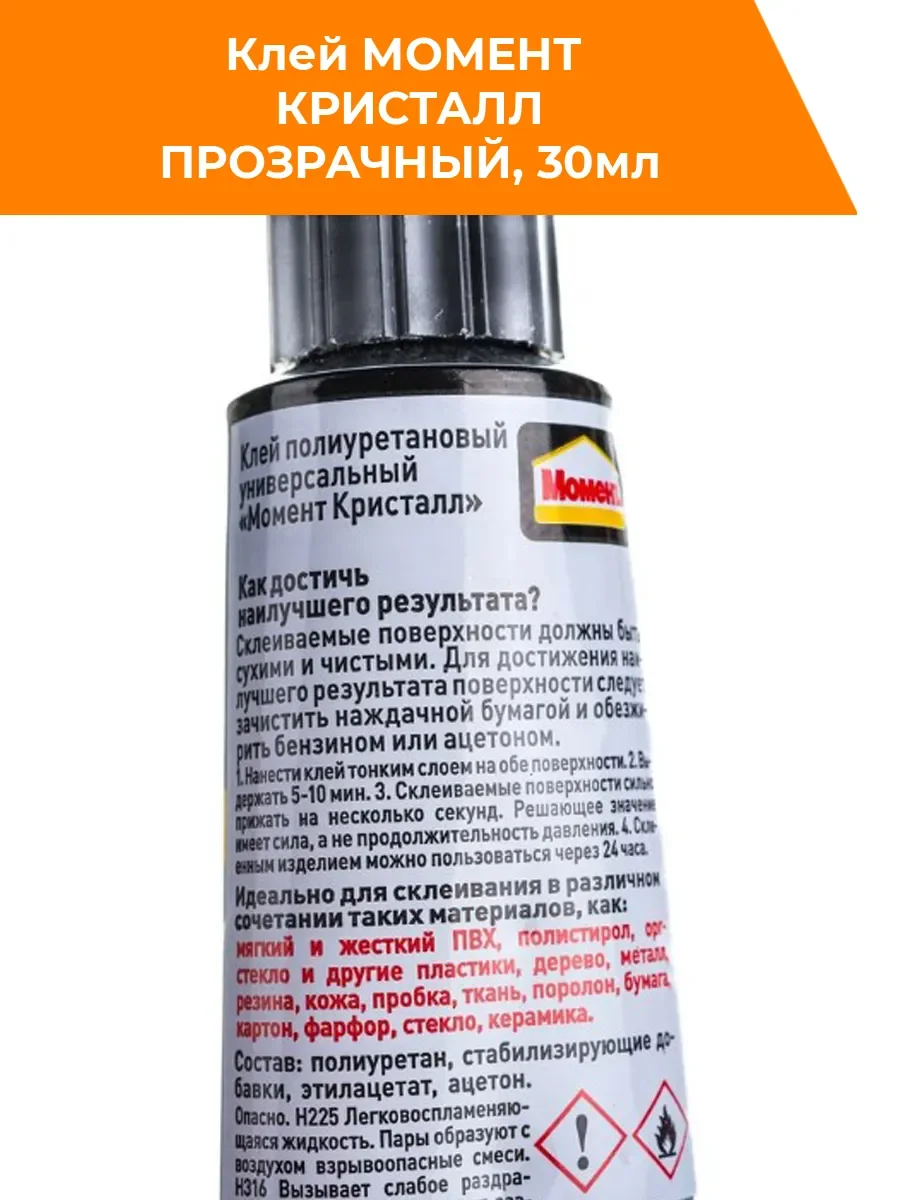 Клей Кристалл Момент является полиуретановым и предназначен для склеивания следующих материалов: мягкого и жесткого поливинилхлорида, полистирола, оргстекла и других пластиков. Можно склеивать в различных сочетаниях дерево, металл, резину, бумагу, картон, кожу, ткань, пробку, поролон, фарфор, керамику, стекло. Шов получается высокопрочным и водостойким. Нельзя использовать для посуды, контактирующей с пищей. Необходимо хранить при температуре о -20ºС до +30ºС. Если клей замерз, то свои свойства он восстановит при комнатной температуре. Поставляется на блистере. Срок годности — 24 месяца.
