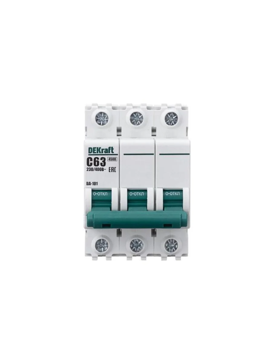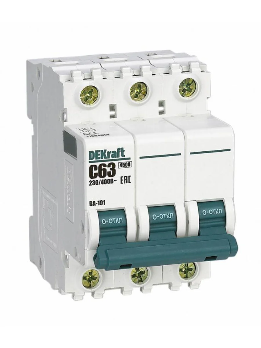 Автоматический выключатель серии ВА-101 Dekraft; 3P; номинальный ток 63 А; характеристика С; отключающая способность 4,5 кА. 5 монолитных заклепок повышают прочность корпуса аппарата. Сплошная лицевая панель обеспечивает безопасность эксплуатации аппарата. Боковые каналы охлаждения повышают стабильность работы при высоких температурах окружающей среды. Есть возможность установки дополнительных аксессуаров с левой стороны устройства. Аппарат на 100% совместим с корпусами Dekraft и Systeme Electric.