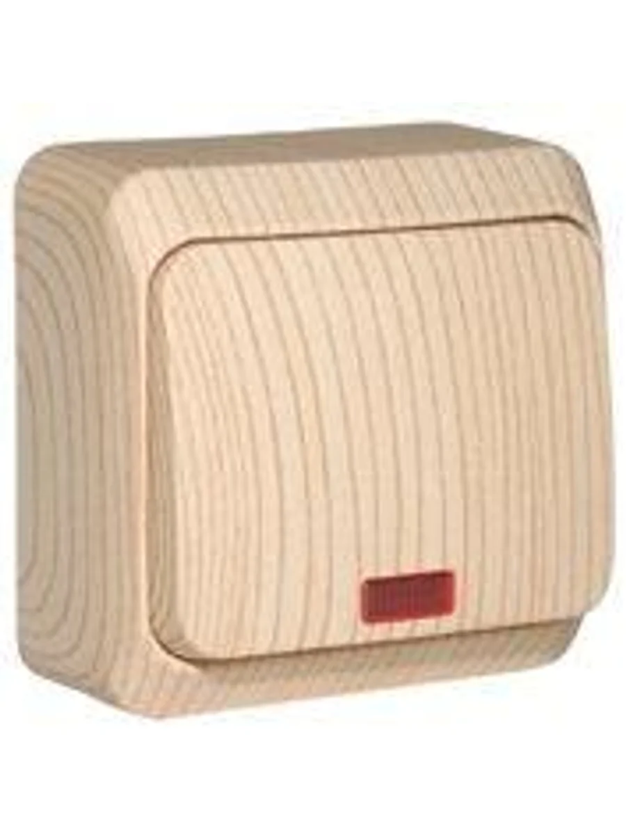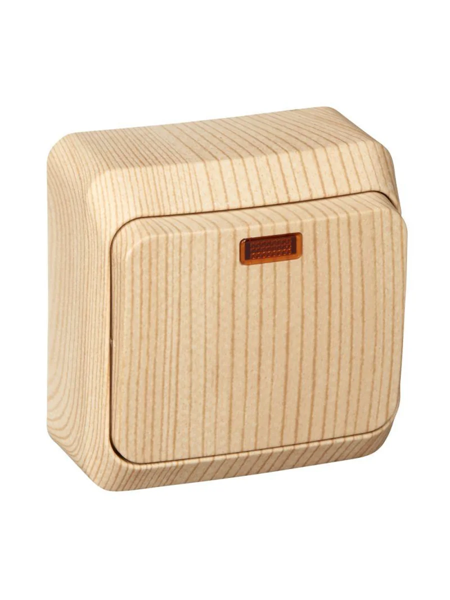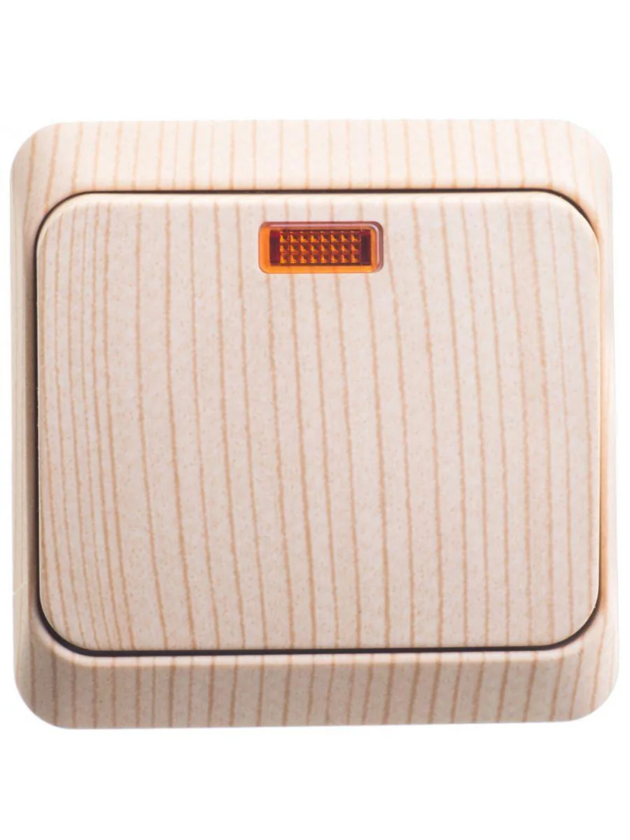 Выключатель Systeme Electric (ранее Schneider Electric) ЭТЮД (сосна, открытой установки) одноклавишный предназначен для применения в сетях до 250В, на ток до 10А. Наличие подсветки делает его легко находимым при отсутствии освещения. Выключатель подходит для большинства типов ламп, включая люминесцентные. Изделия цвета Сосна обладают уникальным рисунком, напоминающим древесный сруб. Сделано в России.