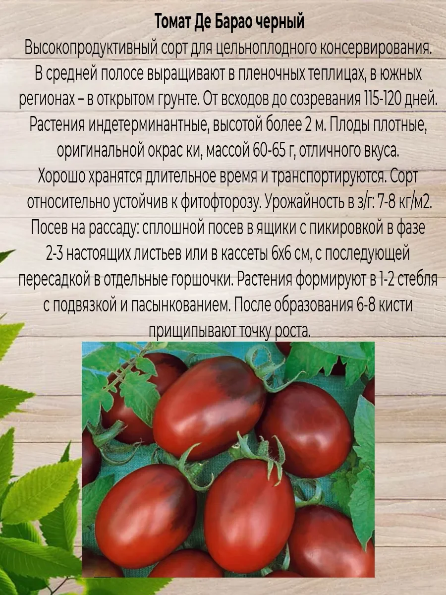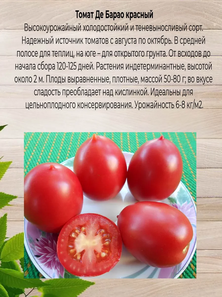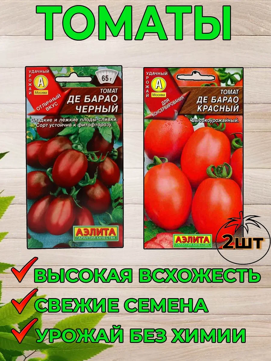 Семена томатов Де Барао агрофирмы АЭЛИТА. Семена томата Де барао - 2 шт. Высокоурожайный холодостойкий и теневыносливый сорт. Надежный источник томатов с августа по октябрь. В средней полосе для теплиц, на юге – для открытого грунта. От всходов до начала сбора 120-125 дней. Растения индетерминантные, высотой около 2 м. Плоды выравненные, плотные, массой 50-80 г; во вкусе сладость преобладает над кислинкой. Идеальны для цельноплодного консервирования. Урожайность 6-8 кг/м2.