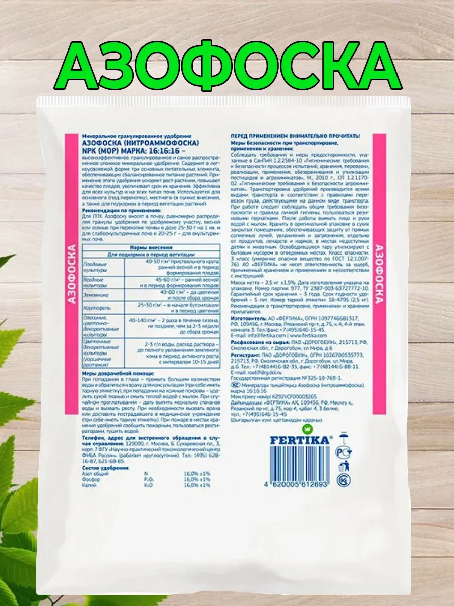 Азофоска (нитроаммофоска) — известное и широко применимое минеральное удобрение. Этот агрохимикат успешно используется под большинство зерновых, овощных и плодовых культур практически на любых видах почв в любом климате. Азофоска 16:16:16 — с равным соотношением N.P.K (азота, фосфора и калия) за счет совместного воздействия ионов этих элементов, оказывает больший эффект, чем внесение калийных, азотных и фосфорных удобрений по отдельности. Разновидность азофоски с равными пропорциями азота, фосфора и калия используют весной при посеве. Под плодовые деревья это удобрение вносят в начале весны в дозировке 2-3 ст.л, под овощные культуры — перец, свеклу, томаты, морковь — в дозировке 0,5 ч.л в момент высадки рассады. Вопреки убеждениям о вреде нитратов, использование азофоски безвредно, но при соблюдении определенных условий. Следует точно соблюдать дозировку удобрения, иначе нитраты начинают накапливаться в клубнях и плодах. Использовать это удобрение можно с апреля по октябрь, однако почва должна быть достаточно прогрета.