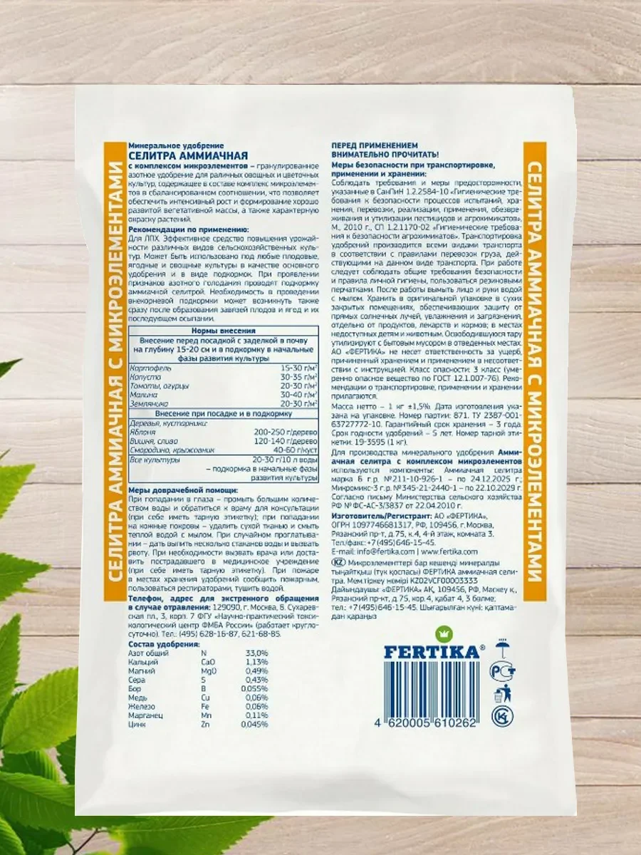 Аммиачная селитра с микроэлементами Fertika — это универсальное азотное удобрение, которое хорошо растворяется в воде. Его следует использовать в качестве основной или дополнительной подкормки любых плодовых, ягодных и овощных культур. Внекорневое внесение производится при проявлении признаков азотного голодания или сразу после образования завязей. Изображение товара может не соответствовать внешнему виду.
