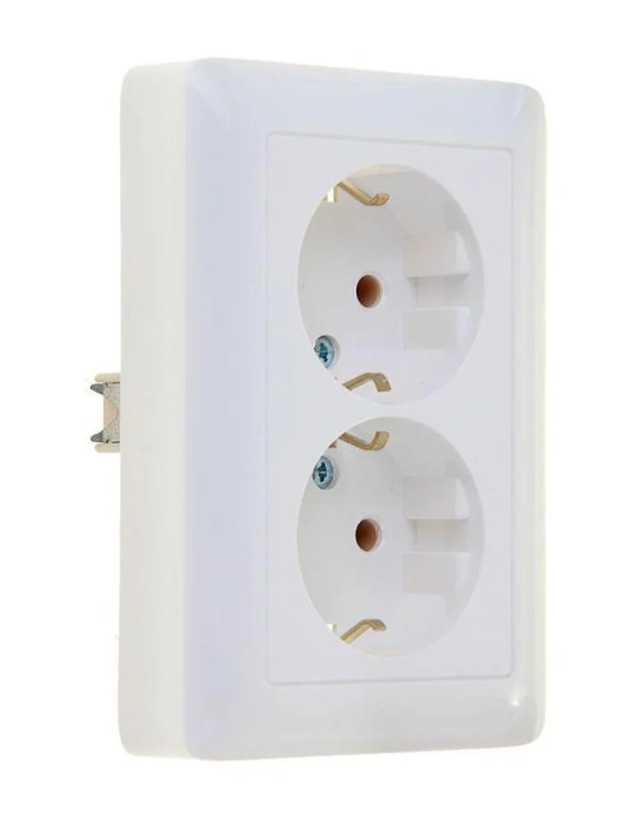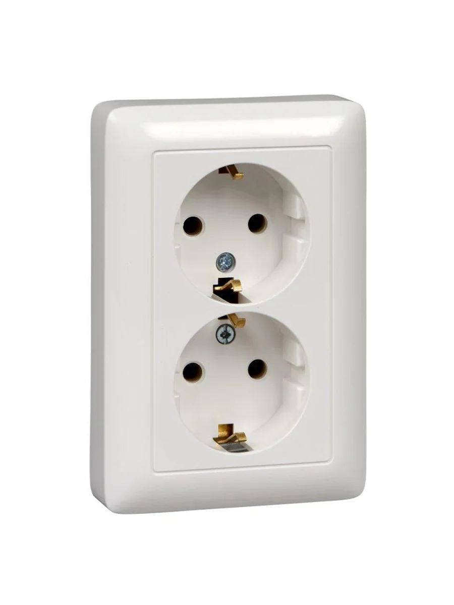 Розетка Systeme Electric (ранее Schneider Electric) ХИТ (скрытой установки, цвет белый) двойная с заземлением, без шторок предназначена для сетей до 250 В на ток до 16 А. Двойная розетка позволяет подключить два устройства в одном месте. Заземляющий контакт обеспечивает дополнительную защиту от удара электрическим током. При наличии заземления электрический потенциал уходит в землю, защищая человека. Сделано в России.