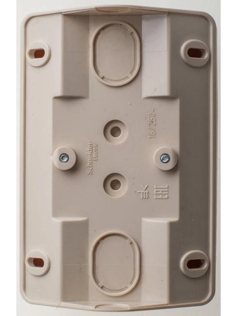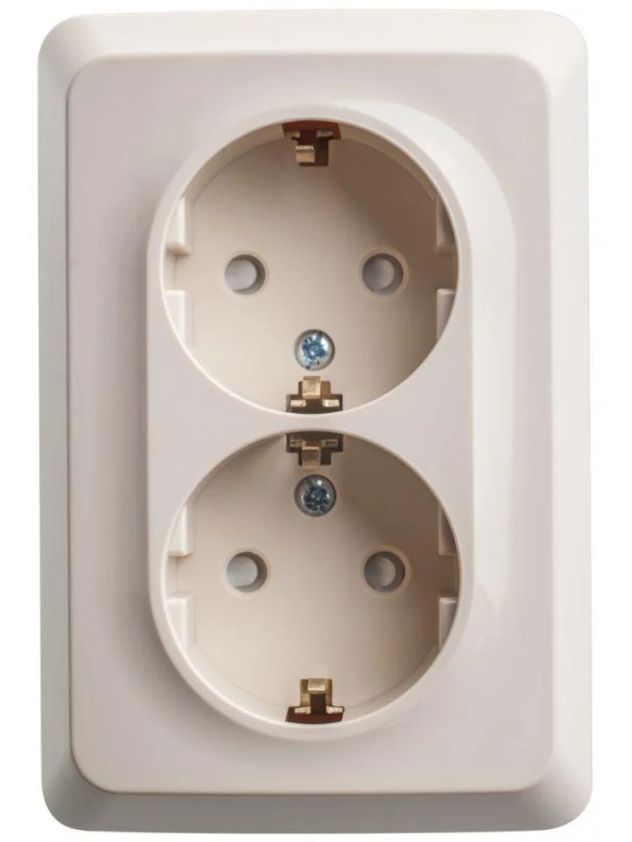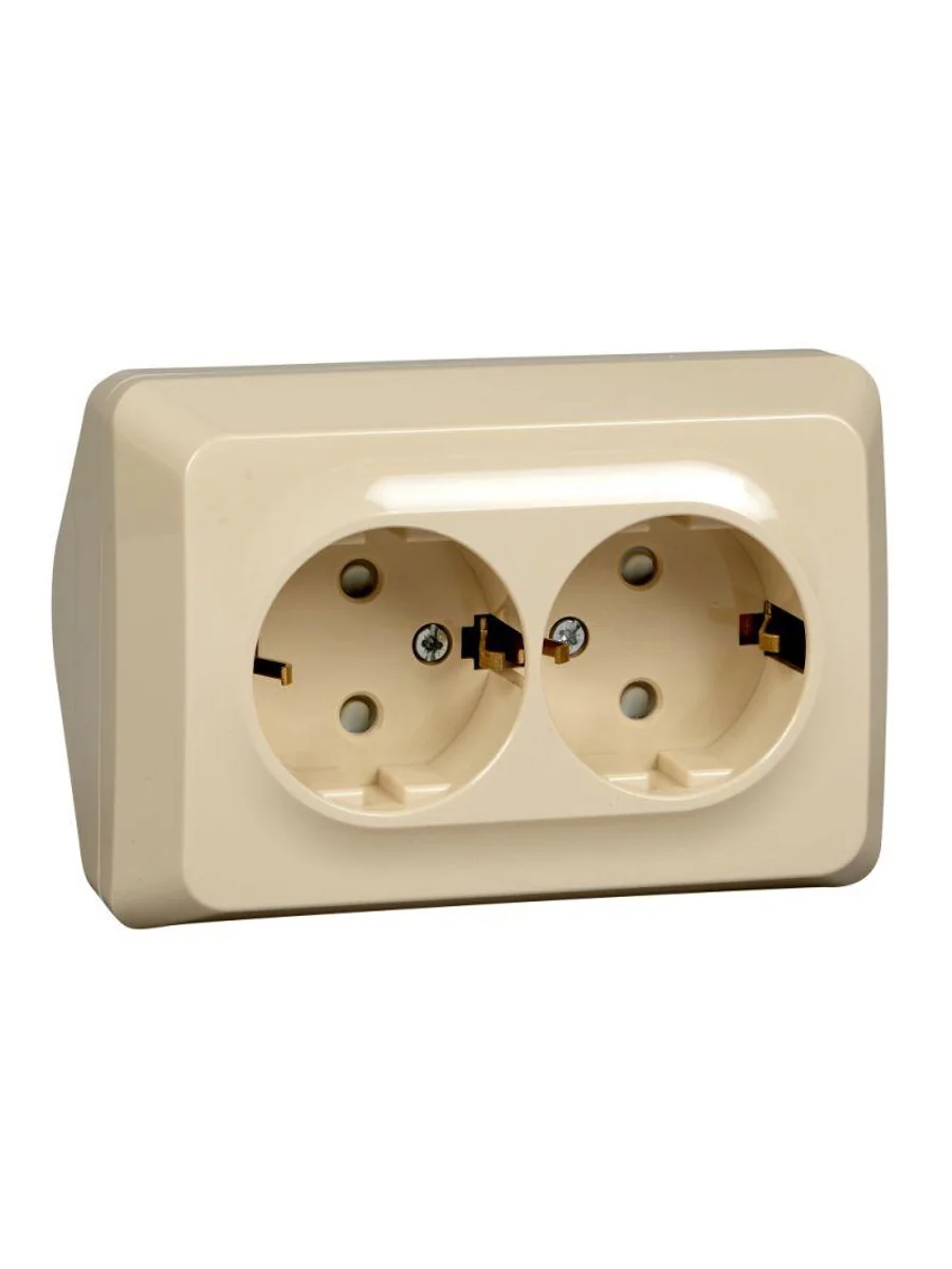 Розетка Systeme Electric (ранее Schneider Electric) ЭТЮД (кремовый, открытой установки) двухместная угловая с заземлением и шторками предназначена для применения в сетях до 250В, на ток до 16А. Ее конструкция позволяет установить розетку в угол помещения. Шторки и заземление обеспечивают дополнительную безопасность при косвенных прикосновениях. Сделано в России.