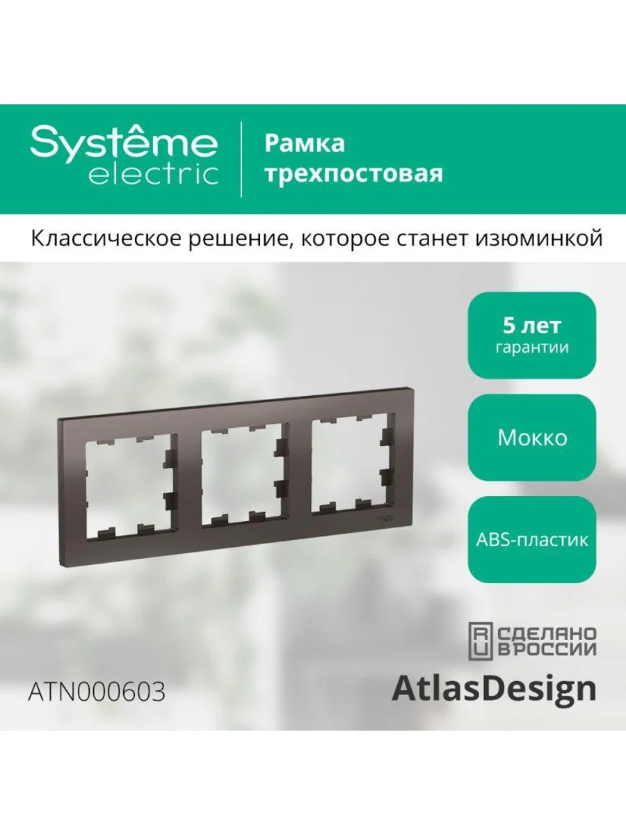 Рамка Systeme Electric (ранее Schneider Electric) серии AtlasDesign в цвете мокко трёхместная. Устанавливается в вертикальном и горизонтальном положениях. Лицевые детали из качественного ABS-пластика, устойчивого к царапинам и УФ-излучению. Позволяет гармонично вписать электроустановочное изделие в интерьер помещения.