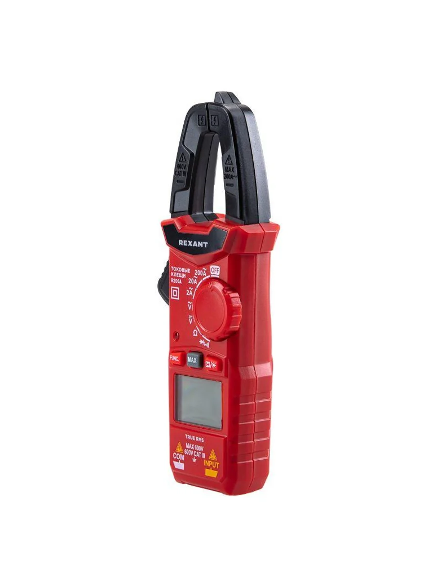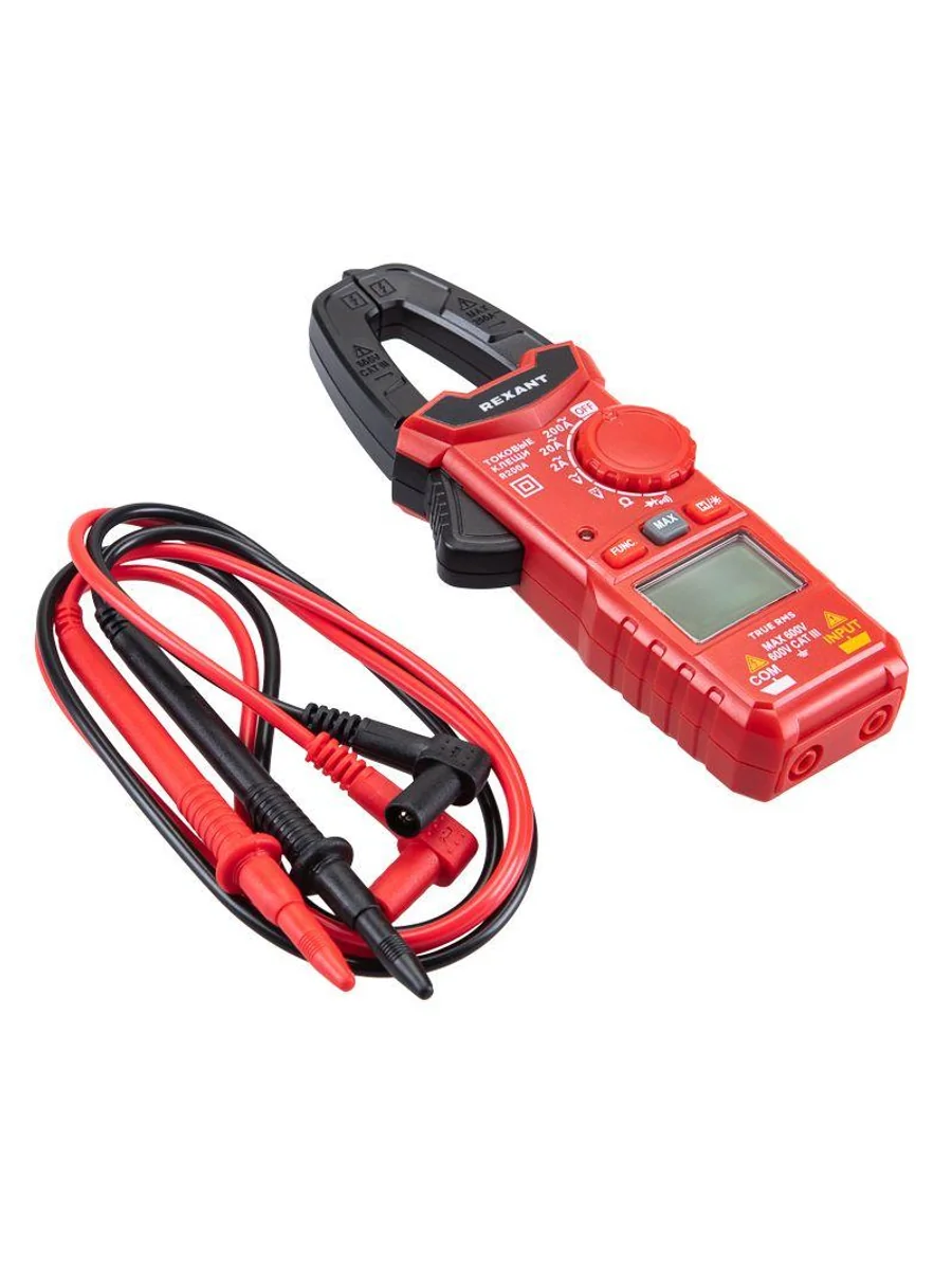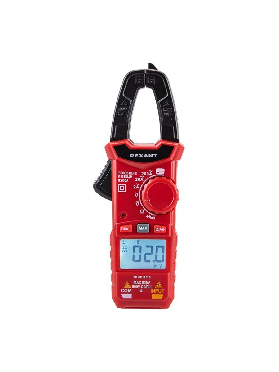 Многофункциональные компактные цифровые токовые клещи R200A REXANT – это прибор, который позволяет измерять переменный ток без разрыва самой цепи, в которой проводится измерение. Выбор пределов измерений – автоматический. Предусмотрена оранжевая подсветка дисплея при наличии силы тока свыше 3 А. Прибор обладает компактными размерами, что упрощает доступ, хранение и транспортировку. Параметры измерений: Постоянное напряжение: 200мВ/2В/20В/200В/600В ± (0.5%) Переменное напряжение: 2В/20В/200В/600В ± (1.0%) Переменный ток: 2А/20А/200А ± (2.5%) Сопротивление: 200 Ом/2кОм/20кОм/200кОм/2МОм/20МОм ± (1.0%) Основные функции и особенности: Автоматический выбор пределов измерений Режим максимальных измерений DATA HOLD Режим «прозвонка», диод- тест Разрядность дисплея: 2000 отсчетов Раскрыв клещей: 25 мм Оранжевая подсветка дисплея при наличии силы тока свыше 3 А Функция подсветки дисплея Автоматическое отключение питания через 15 минут Батарейка: 1,5 В ААА, 2 шт. Вес с батареями: 150 г Габариты: 164х61х30 мм В комплекте: токовые клещи, измерительные щупы, батареи, инструкция