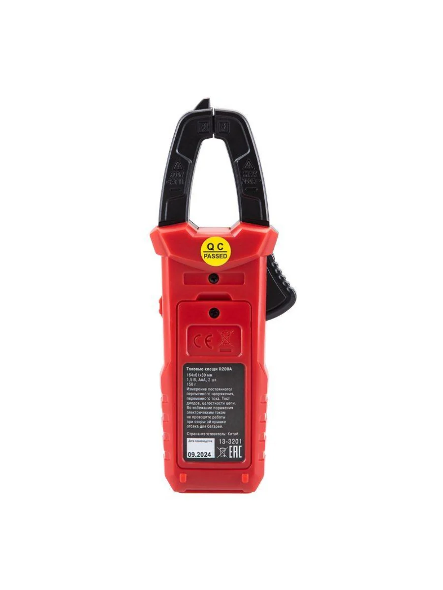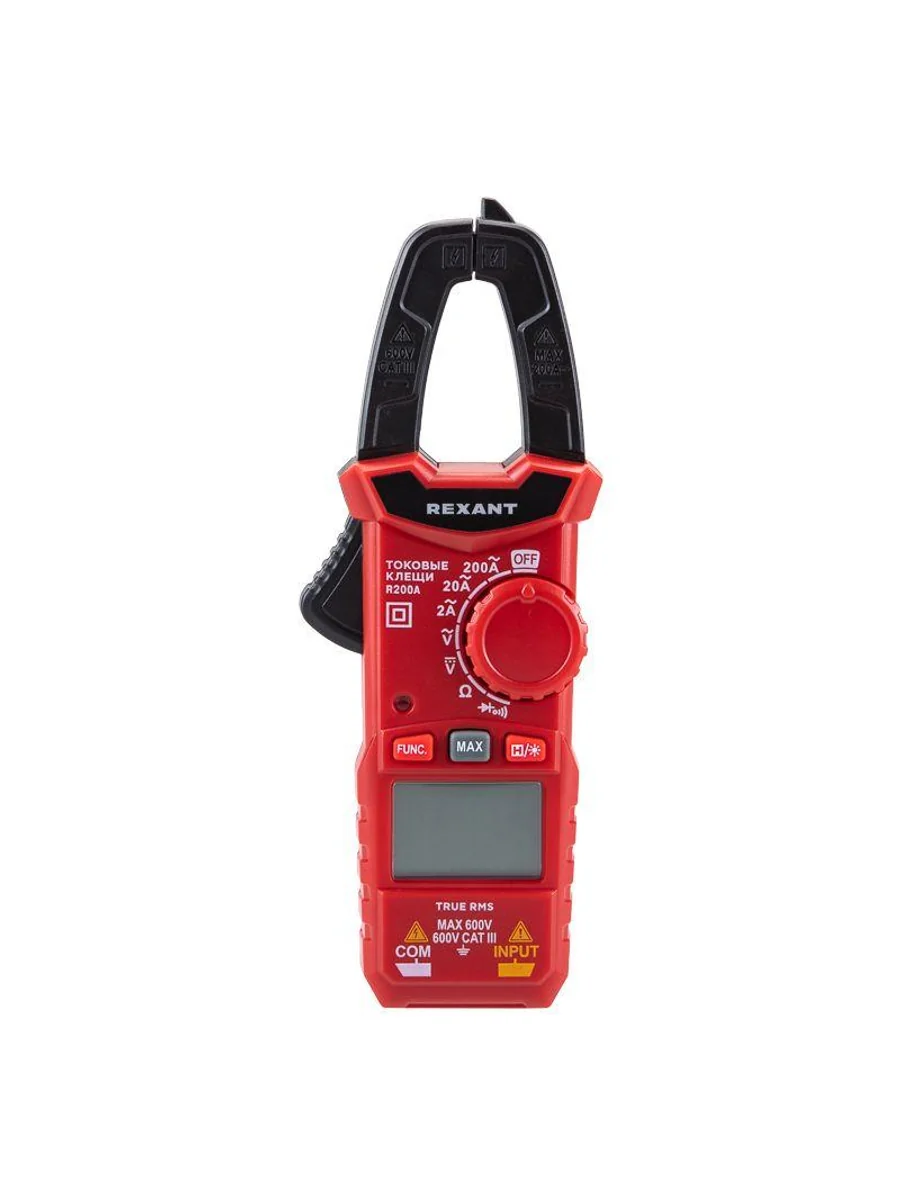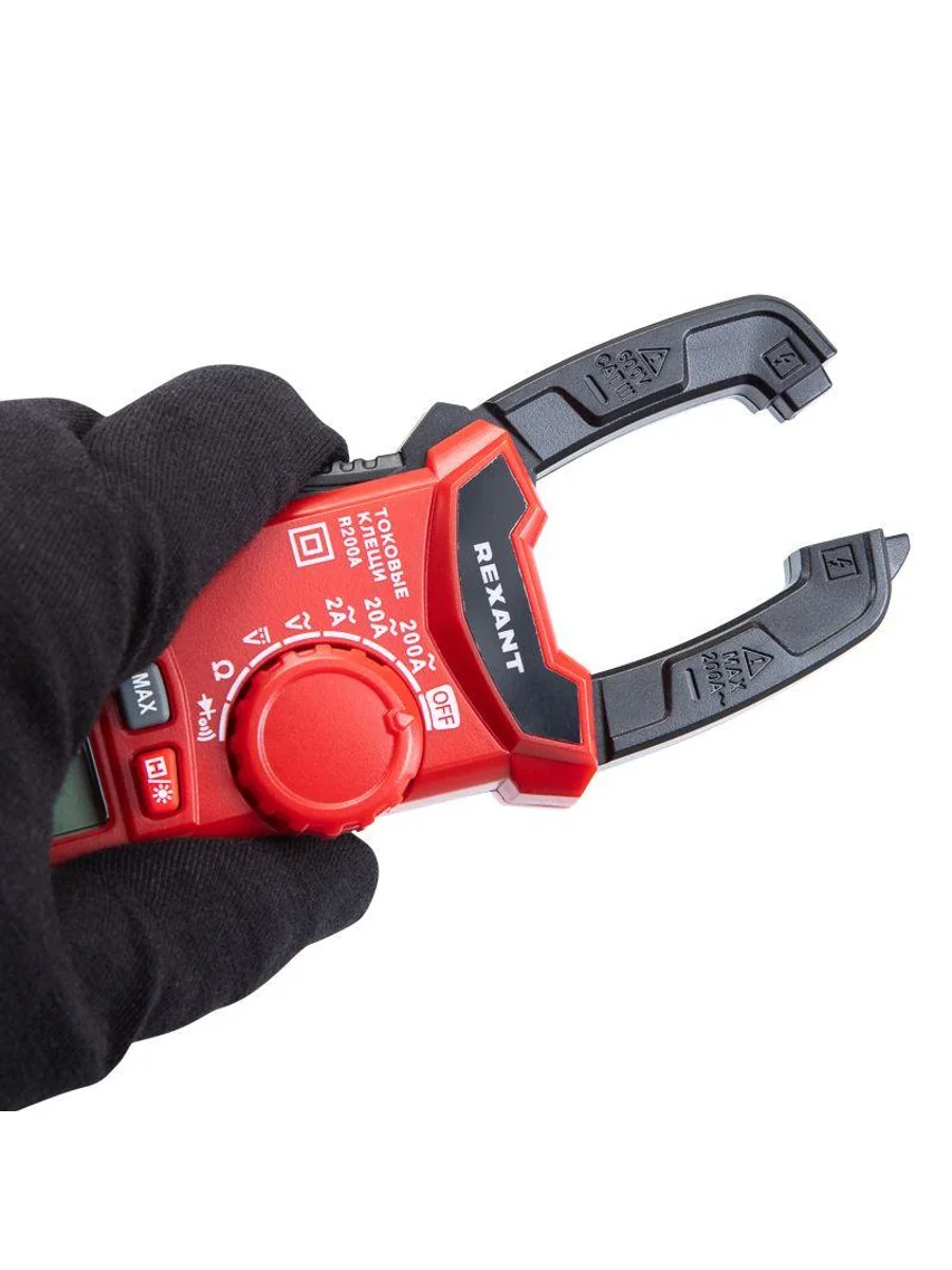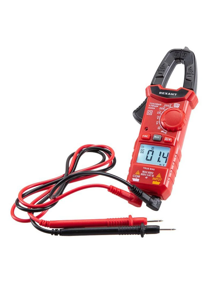 Многофункциональные компактные цифровые токовые клещи R200A REXANT – это прибор, который позволяет измерять переменный ток без разрыва самой цепи, в которой проводится измерение. Выбор пределов измерений – автоматический. Предусмотрена оранжевая подсветка дисплея при наличии силы тока свыше 3 А. Прибор обладает компактными размерами, что упрощает доступ, хранение и транспортировку. Параметры измерений: Постоянное напряжение: 200мВ/2В/20В/200В/600В ± (0.5%) Переменное напряжение: 2В/20В/200В/600В ± (1.0%) Переменный ток: 2А/20А/200А ± (2.5%) Сопротивление: 200 Ом/2кОм/20кОм/200кОм/2МОм/20МОм ± (1.0%) Основные функции и особенности: Автоматический выбор пределов измерений Режим максимальных измерений DATA HOLD Режим «прозвонка», диод- тест Разрядность дисплея: 2000 отсчетов Раскрыв клещей: 25 мм Оранжевая подсветка дисплея при наличии силы тока свыше 3 А Функция подсветки дисплея Автоматическое отключение питания через 15 минут Батарейка: 1,5 В ААА, 2 шт. Вес с батареями: 150 г Габариты: 164х61х30 мм В комплекте: токовые клещи, измерительные щупы, батареи, инструкция