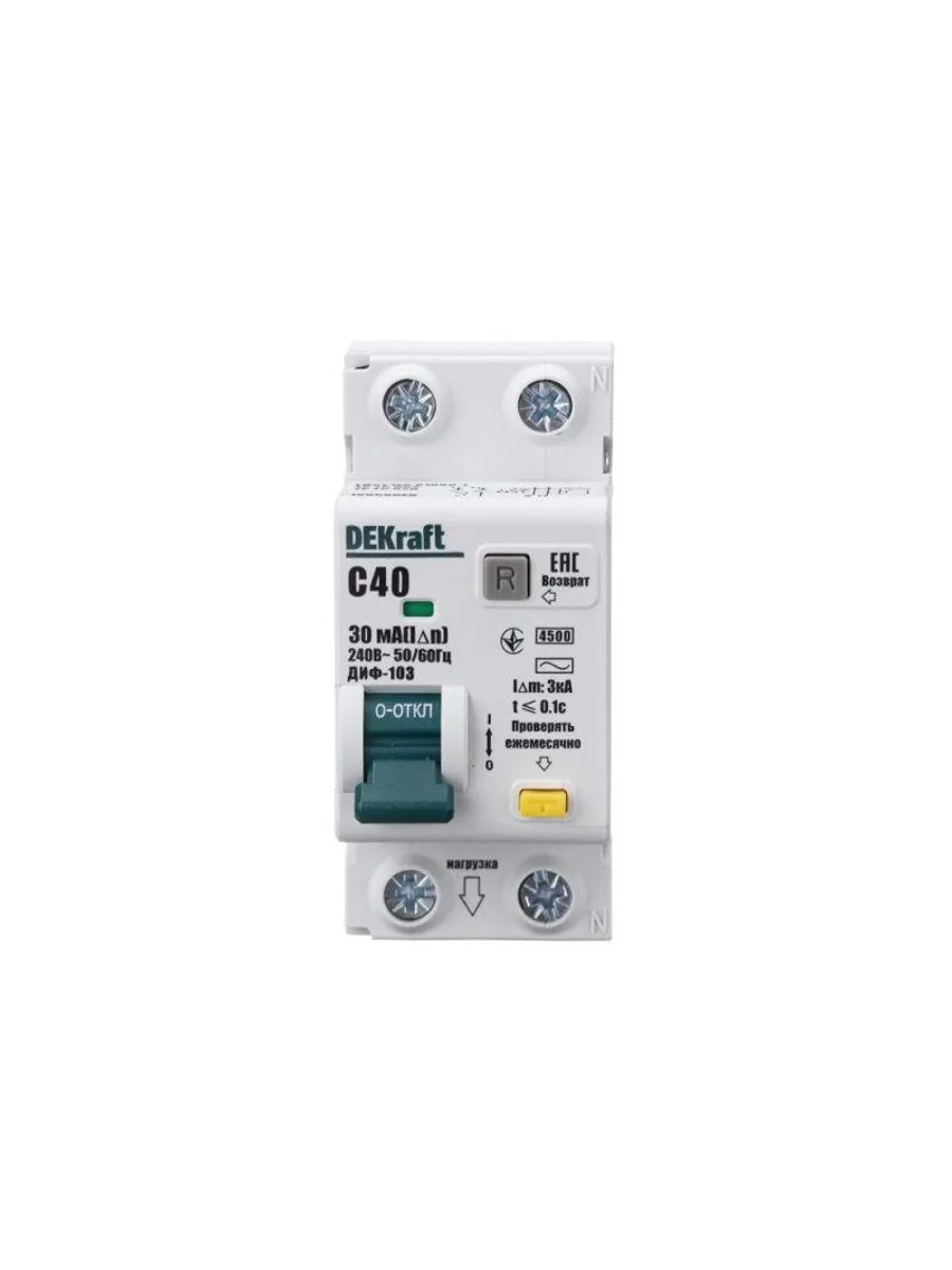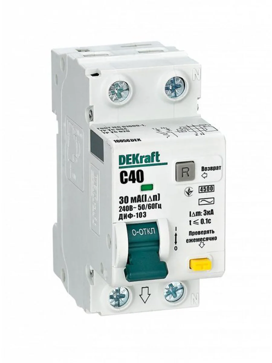 Автоматическими выключателями дифференциального тока серии ДИФ-103 Dekraft; 1N+P; номинальный ток 40 А; ном.дифф. ток 30 мА; тип дифференциального расцепителя - AC; кривая отключения - С; на DIN-рейку. АВДТ (автоматическими выключателями дифференциального тока) сочетают функции автоматического выключателя и УЗО (ВДТ), обеспечивают три вида защиты — от короткого замыкания, перегрузки и возникновения утечки тока (в частности, вследствие прикосновения человека к токоведущим частям). АВДТ с отключающей способностью 4,5кА применяются в распределительных, учётно-распределительных, телекоммуникационных щитах и др. в жилищном, гражданском строительстве, сельском хозяйстве, инфраструктуре объектов промышленности.