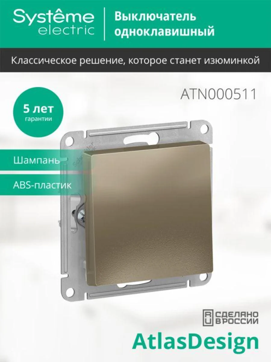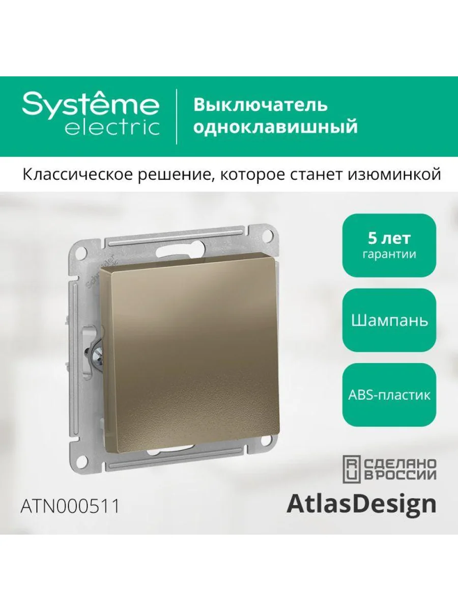 Механизм Systeme Electric (ранее Schneider Electric) серии AtlasDesign в цвете шампань выключателя 1-клавишного подходит для сетей 250 В, на ток 10 А. Лицевые детали из качественного ABS-пластика, устойчивого к царапинам и УФ-излучению. Усиленные прямые монтажные лапки для лучшей фиксации механизма в монтажной коробке.