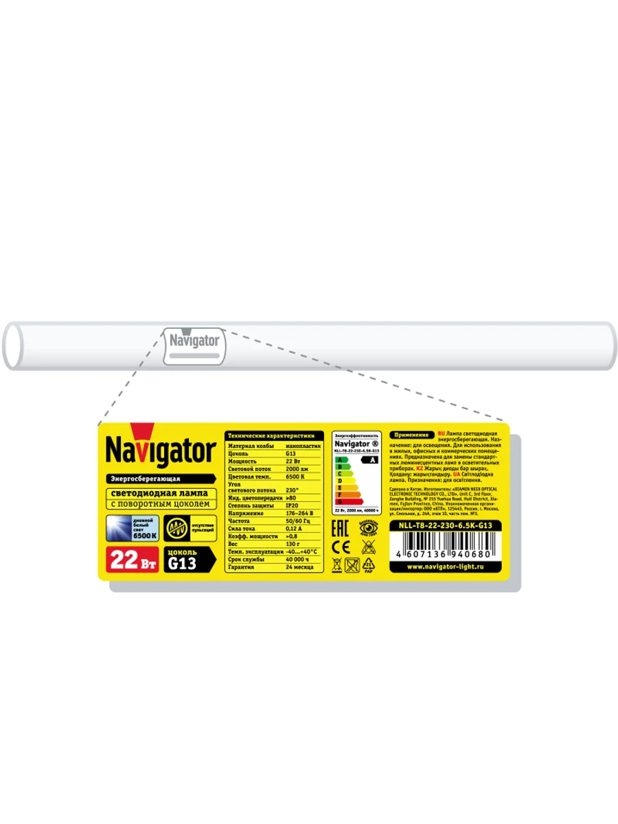 Лампа светодиодная 94 068 NLL-T8-22-230-6.5K-G13 22Вт линейная 6500К холод. бел. G13 2000лм 176-264В поворотный цоколь Navigator 94068 - купить в KeepBuilding | KeepBuilding
