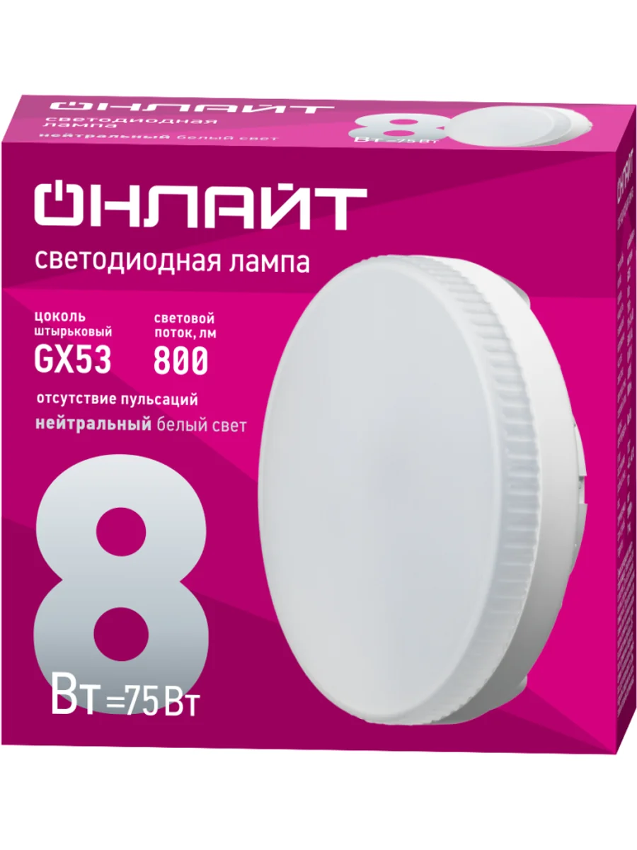Лампа светодиодная 71 639 OLL-GX53-8-230-4K ОНЛАЙТ 4670004716397 – лампа с колбой вида "таблетка", белого света, диаметром 74 мм, с цоколем GX53, мощностью 8 Вт. Цветовая температура 4000 К.