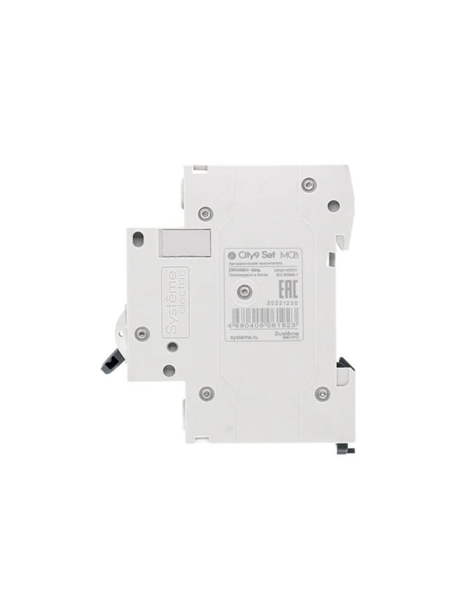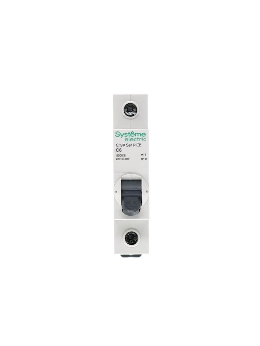 Автоматический выключатель серии City9 Set Systeme Electric, 1-полюсный, номинальный ток 6 А, характеристика С, Icn = 4.5 кА. Применяется в электрических сетях напряжением 230 В. Предназначен для защиты от перегрузок и токов короткого замыкания. Оснащен механизмом «мгновенной коммутации». Ударопрочный корпус из специального пластика с 6 металлическими заклепками. Безопасные клеммы исключают попадание кабелей в заклеммное пространство (ранее Schneider Electric EZ9F34106).