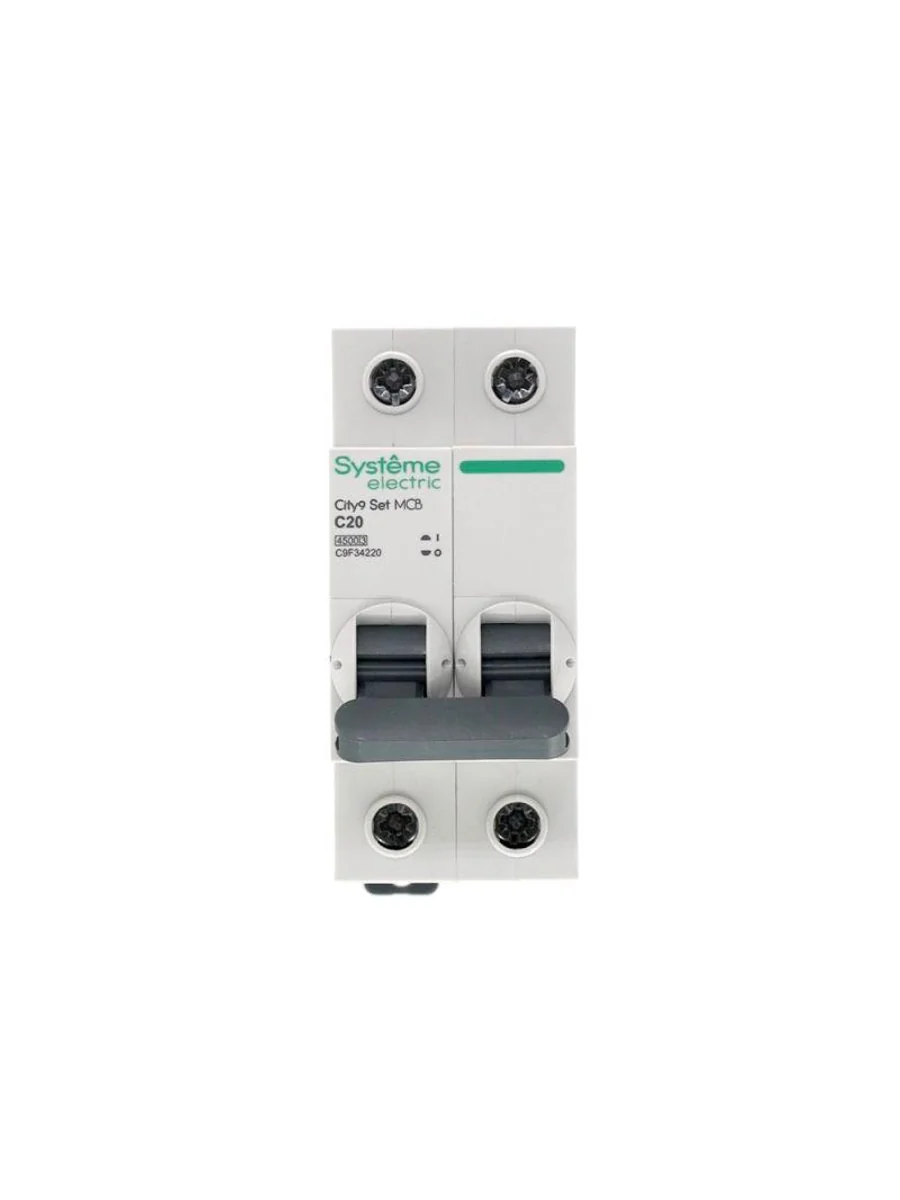 Автоматический выключатель серии City9 Set Systeme Electric, 2-полюсный, номинальный ток 20 А, характеристика С, Icn = 4.5 кА. Применяется в электрических сетях напряжением 230 В. Предназначен для защиты от перегрузок и токов короткого замыкания. Оснащен механизмом «мгновенной коммутации». Ударопрочный корпус из специального пластика с 6 металлическими заклепками. Безопасные клеммы исключают попадание кабелей в заклеммное пространство (ранее Schneider Electric EZ9F34220).