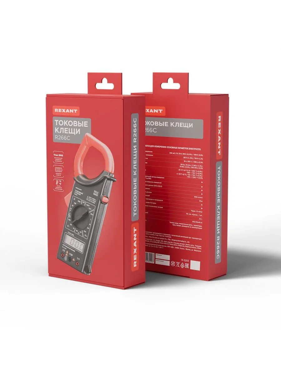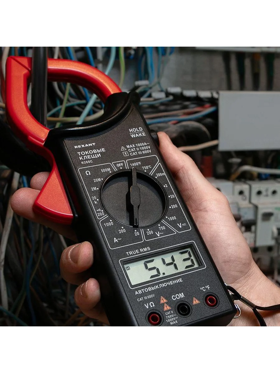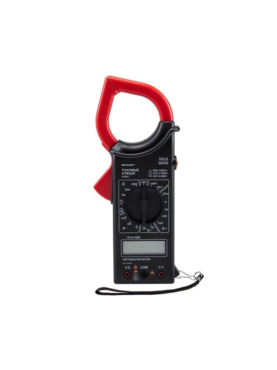 Многофункциональные компактные цифровые токовые клещи R266C REXANT– это прибор, который позволяет измерять переменный ток без разрыва самой цепи, в которой проводится измерение. Модель R266C представлена в обновленном дизайне. Среднеквадратичный метод измерения значений (True RMS) гарантирует точные результаты измерений. Подключение датчика температуры производится через обычное гнездо для щупов, что значительно упрощает процесс работы и расширяет функционал прибора. Выбор диапазонов измерений – ручной. Встроена функция автоотключения, способствующая экономии заряда батареи. Параметры измерений: Постоянное напряжение: 200мВ/2В/20/В200В/1000В ± (0.8%) ? Переменное напряжение: 200В/750В ± (1.2%) Переменный ток: 20A/200A/1000A ± (2.5%)? Сопротивление: 200 Ом/2 МОм ± (5.0%) Температура: от 0 °С до +750 °С ± (3.0%)? Основные функции и особенности: Среднеквадратичный метод измерения значений – True RMS Ручной выбор пределов измерений Функция памяти данных DATA HOLD Режим «прозвонка» Автоматическое отключение питания через 15 минут Разрядность дисплея: 2000 отсчетов Раскрыв клещей: 50 мм Индикация перегрузки и полярности Индикация заряда батареи Батарея: ААА 2 шт х1,5В Вес с батареей: 314 г Габариты: 235х100х46 мм В комплекте: токовые клещи, измерительные щупы, термопара, чехол, батарея, инструкция