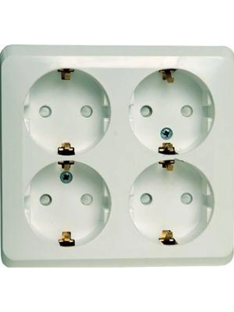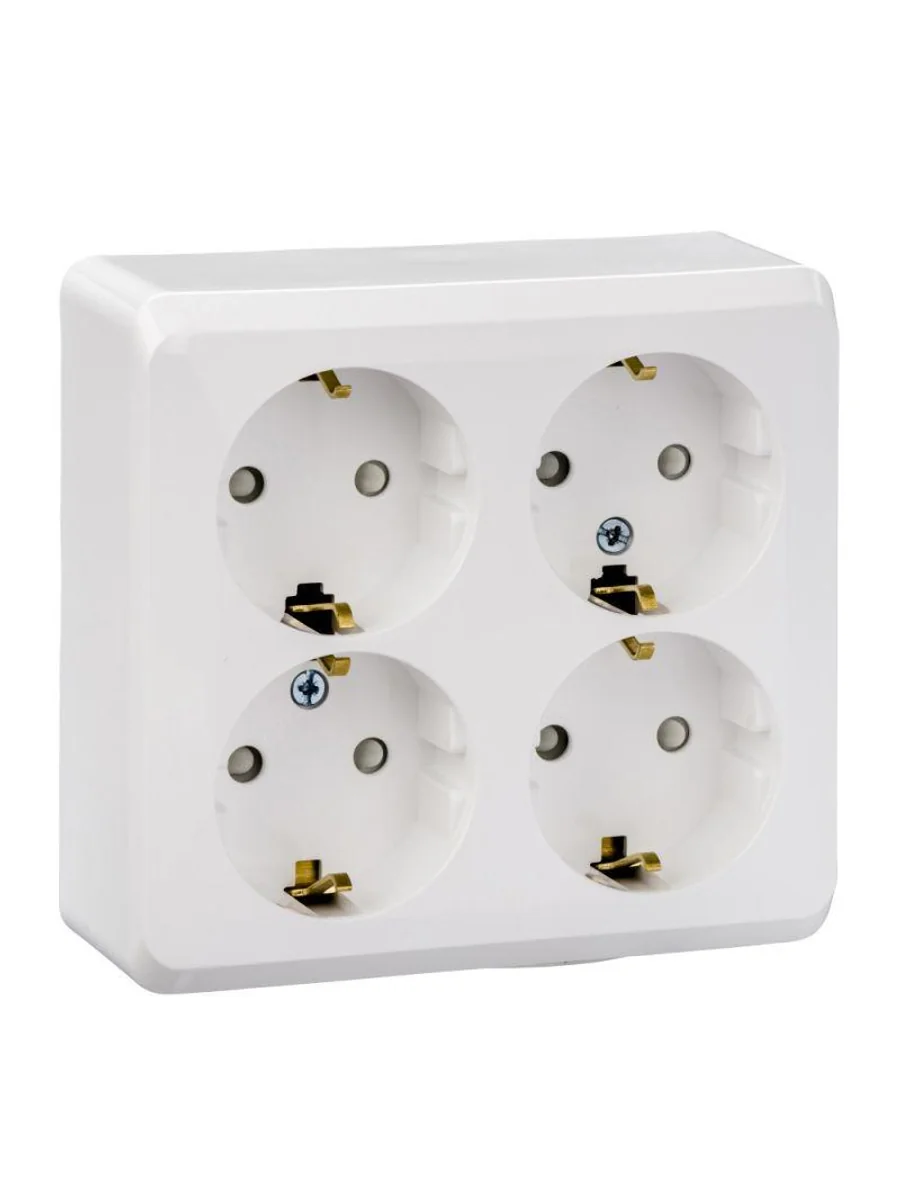 Розетка Systeme Electric (ранее Schneider Electric) ЭТЮД (белый, открытой установки) четырёхместная с заземлением и шторками предназначена для применения в сетях до 250В, на ток до 16А. Четырёхместная розетка позволяет подключить четыре устройства в одном месте. Шторки и заземление обеспечивают дополнительную безопасность при косвенных прикосновениях. Сделано в России.