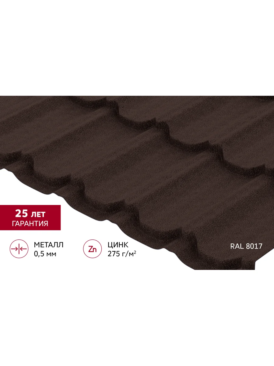 Металлочерепица «Квинта плюс» («Kvinta plus») 0,5 Velur X в цвете RAL 8017 шоколад от бренда GrandLine — это высококачественный материал для кровли, который сочетает в себе эстетичный внешний вид и отличные эксплуатационные характеристики. Она изготовлена из прочного металла с толщиной слоя 0,5 мм, что обеспечивает долговечность и устойчивость к механическим воздействиям. Покрытие Velur X придаёт поверхности металлочерепицы особую текстуру и защищает от коррозии, увеличивая срок службы материала. Цвет RAL 8017 шоколад гармонично впишется в любой архитектурный стиль, придавая кровле изысканный и современный вид. Металлочерепица «Квинта плюс» идеально подходит для использования в частном строительстве, а также при реконструкции и ремонте существующих кровель. Её лёгкость и простота монтажа позволяют сократить время и затраты на установку. Благодаря своей прочности и устойчивости к внешним воздействиям, металлочерепица сохраняет свои свойства на протяжении многих лет, не требуя дополнительного ухода. Это надёжный выбор для тех, кто ценит качество и долговечность. Преимущества металлочерепицы «Квинта плюс»: