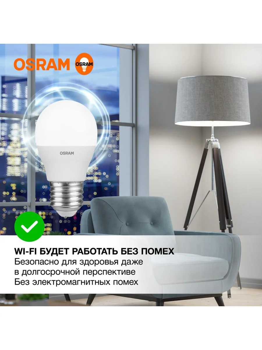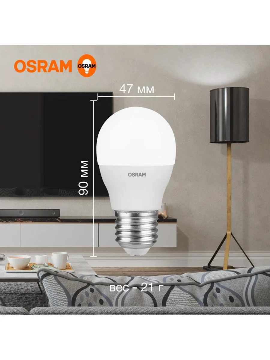 Светодиодные лампы OSRAM - разумная замена традиционным лампам накаливания или галогенным лампам. Светодиодные лампы OSRAM снижают затраты на освещение до 90% при сохранении привычного уровня освещенности. Эта лампа OSRAM серии LED Value выполнена в форме колбы P ("шарик") с цоколем E27. Материал колбы - пластик, исполнение - матовое. Световой поток 560 люмен, что соответствует лампе накаливания на 60 Вт. Такие лампы применяются для внутреннего освещения, хотя в закрытом светильнике можно использовать и на улице. Эта лампа излучает нейтральный белый свет, угол пучка - широкий. Качество света на высоте: низкие пульсации защищают глаза, а высокий индекс цветопередачи позволяет видеть мир в его истинном цвете. Кроме того, лампы OSRAM полностью безопасны для здоровья, поскольку в них нет опасных материалов по европейскому стандарту RoHS, а также они не производят вредных электромагнитных излучений, что подтверждено ЭМС (сертификат электромагнитной совместимости). Лампа проработает долго: срок службы - 25000 часов, 2 года гарантии. Светодиодные лампы OSRAM - умный выбор для здоровья семьи и кошелька!