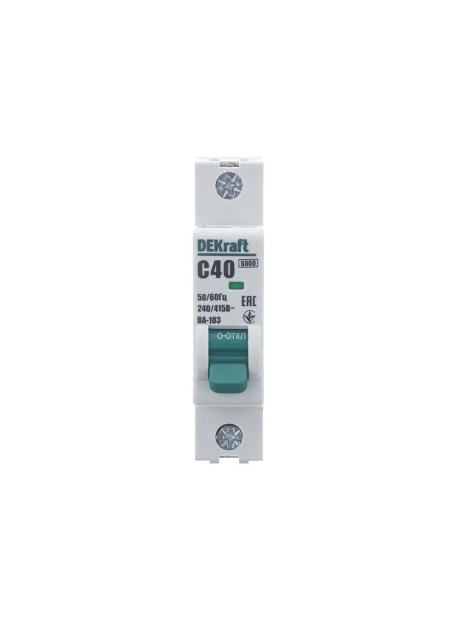 Автоматический выключатель серии ВА-103 NEW Dekraft; 1P; номинальный ток 40 А; характеристика C; отключающая способность 6 кА, что позволяет использовать аппараты в качестве вводных. 5 монолитных заклепок повышают прочность корпуса аппарата. Окошко-индикатор всегда показывает состояние контактов вне зависимости от положения рукоятки управления. Боковые каналы охлаждения повышают стабильность работы при высоких температурах окружающей среды. Есть возможность установки дополнительных аксессуаров с левой стороны устройства. Аппарат на 100% совместим с корпусами и оболочками Dekraft, Systeme Electric.