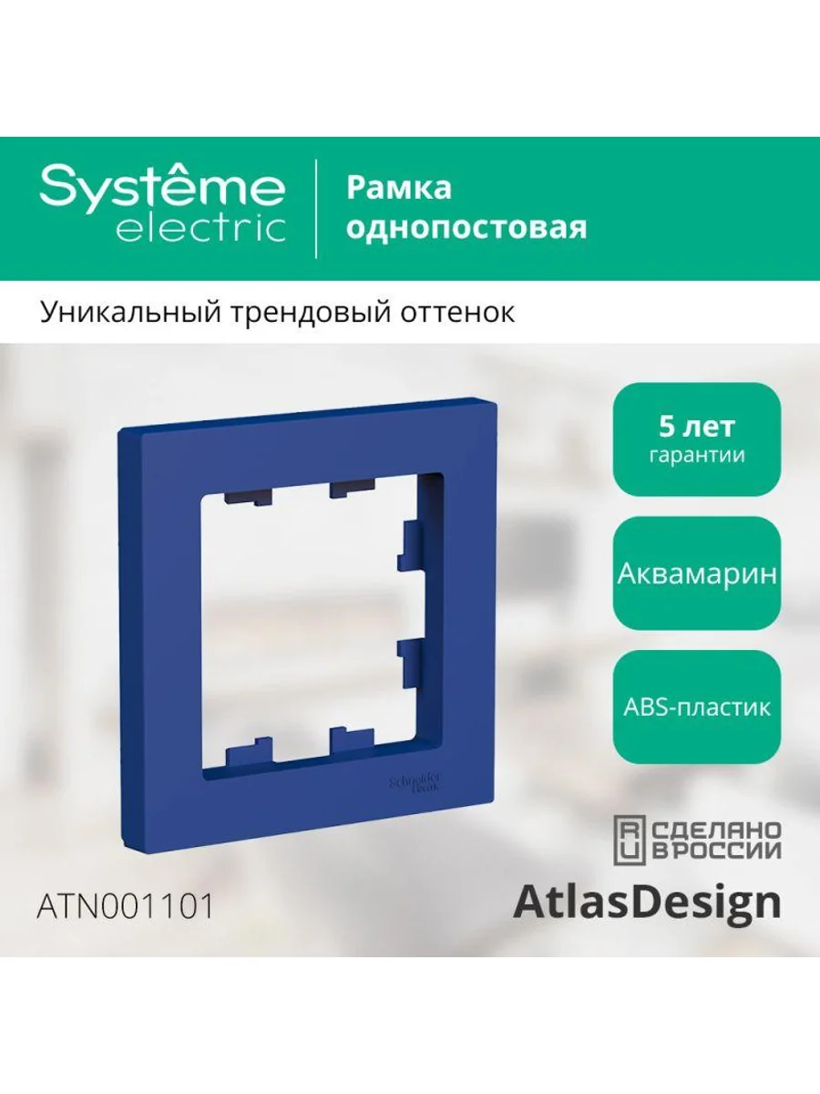 Рамка Systeme Electric (ранее Schneider Electric) серии AtlasDesign в цвете аквамарин одинарная. - Лицевые детали из качественного ABS-пластика, устойчивого к царапинам и УФ-излучению. - Позволяет гармонично вписать электроустановочное изделие в интерьер помещения.