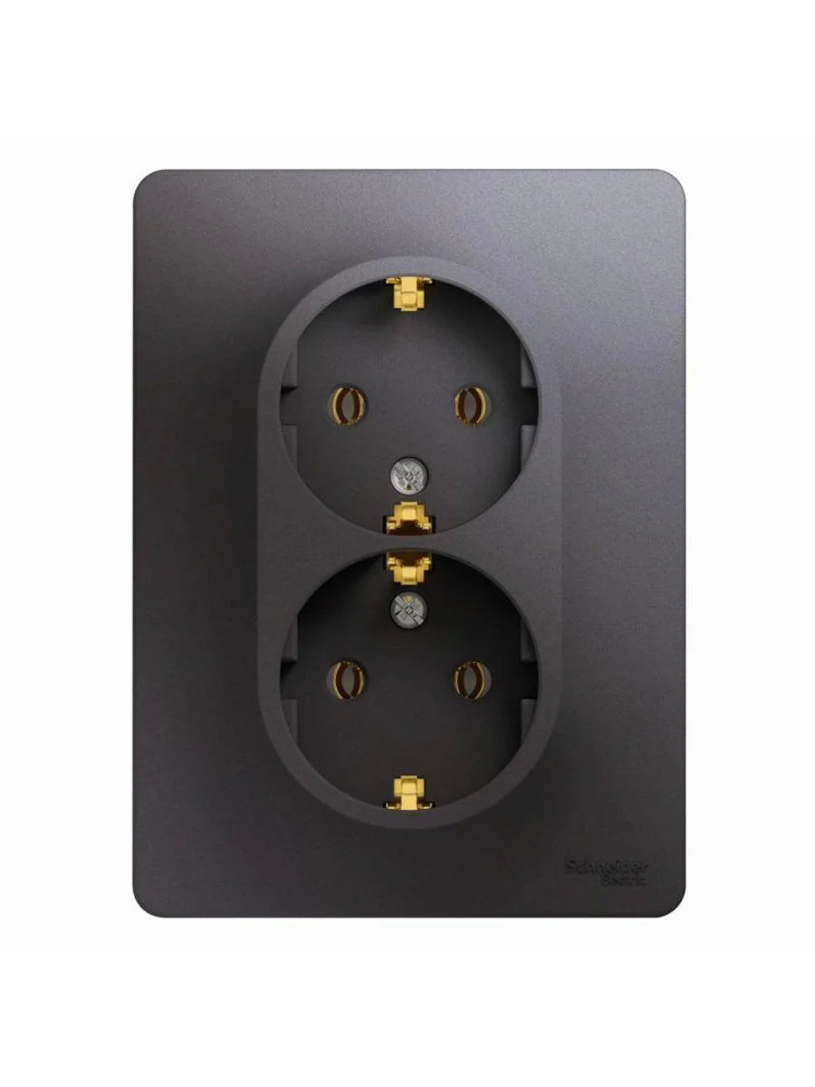 Розетка двойная Systeme Electric (ранее Schneider Electric) серии Glossa (в сборе, цвет графит) с заземлением, без шторок подходит для сетей 250 В, на ток 16 А. - Заземляющий контакт обеспечивает дополнительную защиту от удара электрическим током. При наличии заземления электрический потенциал уходит в землю, защищая человека. - Выполнен из материала PС+ASA, стойкого к УФ-излучению и появлению царапин. - Двойная розетка позволяет подключить два устройства в одном месте.