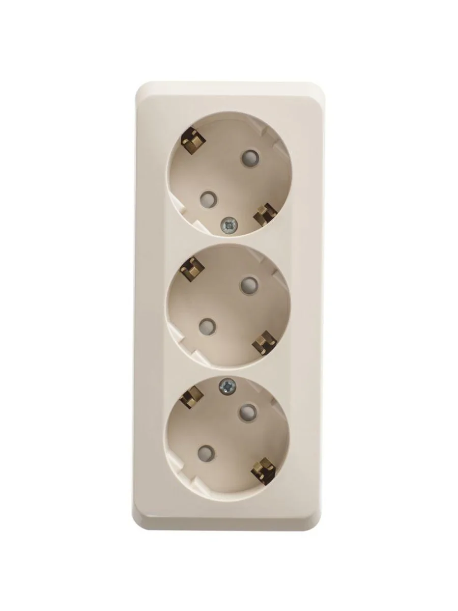 Розетка Systeme Electric (ранее Schneider Electric) ЭТЮД (кремовый, открытой установки) трёхместная с заземлением и шторками предназначена для применения в сетях до 250В, на ток до 16А. Трёхместная розетка позволяет подключить три устройства в одном месте. Шторки и заземление обеспечивают дополнительную безопасность при косвенных прикосновениях. Сделано в России.
