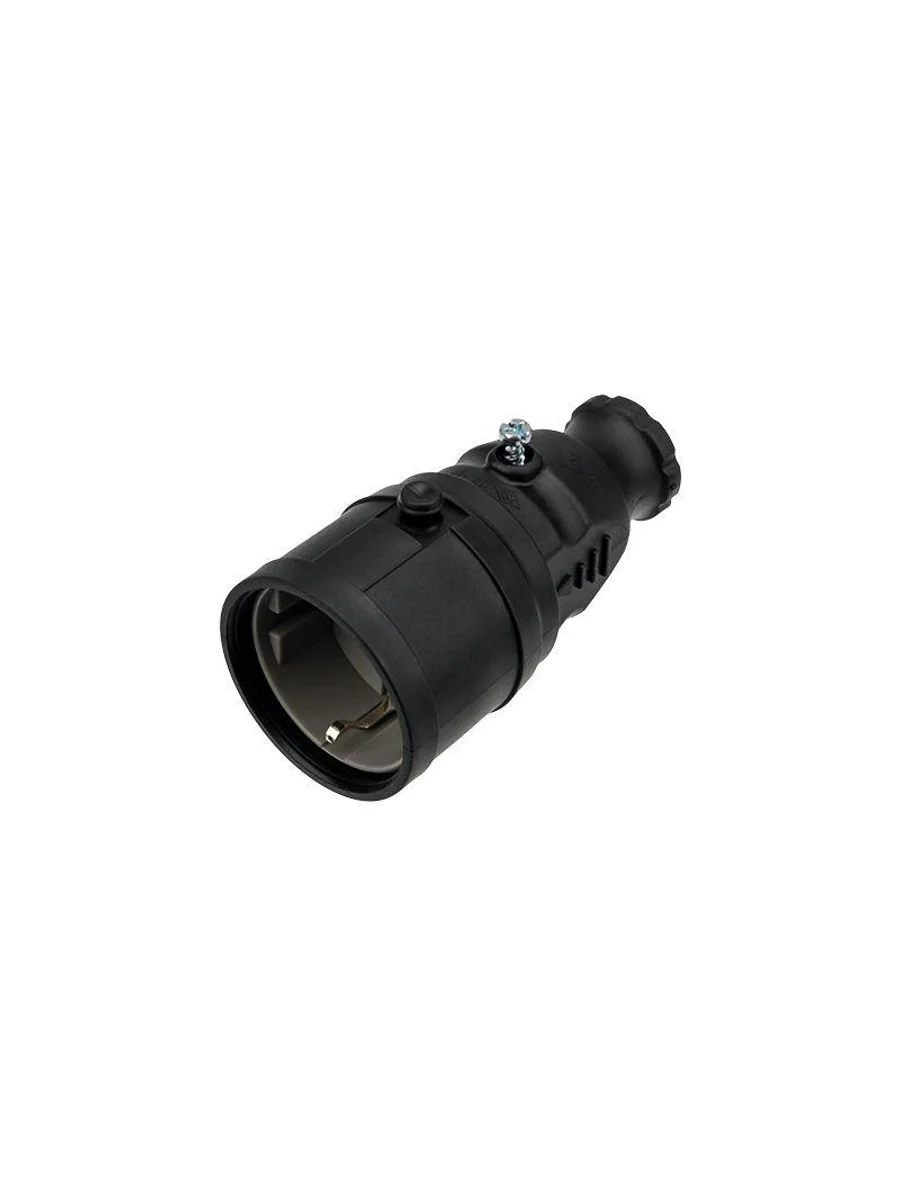 Электрическая влагозащищенная переносная розетка предназначена для подключения бытовых и профессиональных приборов к электросети. Разработана для использования в сложных эксплуатационных условиях с высокой влажностью. Широко применяется в быту, на производстве и в строительстве. Розетка имеет степень защиты IP20 – без включенной вилки и не защищена от капель и брызг воды. Совместно с включенной влагозащищенной вилкой розетка имеет степень защиты IP44, что позволяет использовать розетку для организации электропитания под открытым небом, а в дождь – под навесом. Не допускается погружение в воду. Розетка оснащена защитной крышкой. Для обеспечения безопасности детали, соприкасающиеся с токоведущими частями выполнены из огнеупорного материала, устойчивого к температуре до +850 ?С. Ударопрочный разборный корпус выполнен из каучука: устойчив к ударам, вибрациям и другим механическим воздействиям. Заземление: есть. Сечение проводников: 0,75-2,5 мм2. Контактная группа: MS-58 (латунь). Тип полюсов: 2Р+РЕ.