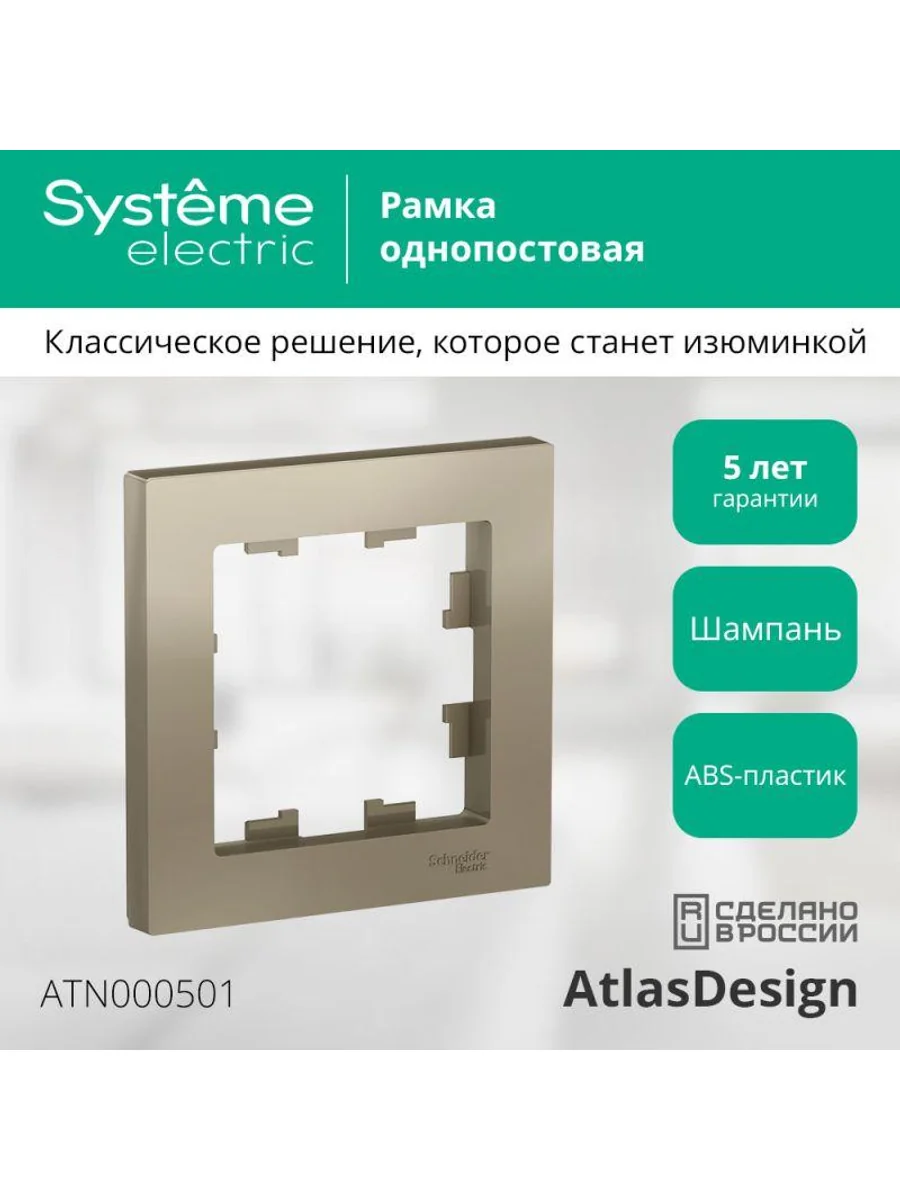 Рамка Systeme Electric (ранее Schneider Electric) серии AtlasDesign в цвете шампань одинарная. - Лицевые детали из качественного ABS-пластика, устойчивого к царапинам и УФ-излучению. - Позволяет гармонично вписать электроустановочное изделие в интерьер помещения.