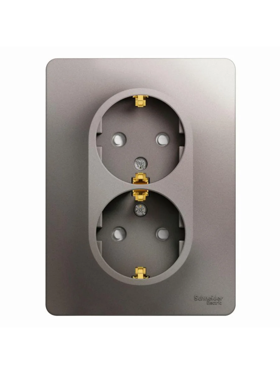 Розетка двойная Systeme Electric (ранее Schneider Electric) серии Glossa (в сборе, цвет платина) с заземлением и шторками подходит для сетей 250 В, на ток 16 А. - Заземляющий контакт обеспечивает дополнительную защиту от удара электрическим током. При наличии заземления электрический потенциал уходит в землю, защищая человека. - Выполнен из материала PС+ASA, стойкого к УФ-излучению и появлению царапин. - Двойная розетка позволяет подключить два устройства в одном месте.