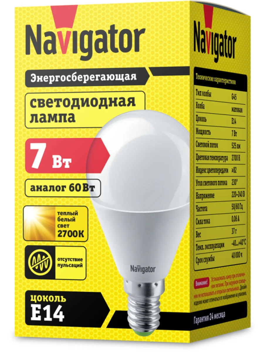 Лампа светодиодная 94 466 NLL-G45-7-230-2.7K-E14 Navigator 4607136944664 – лампа с колбой вида "шар", теплого белого света, длиной 70 мм, с цоколем Е14, мощностью 7 Вт. Цветовая температура 2700 К.