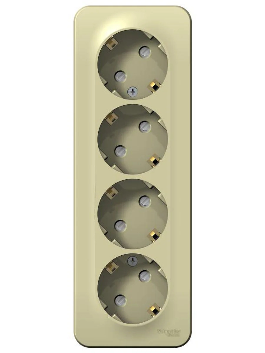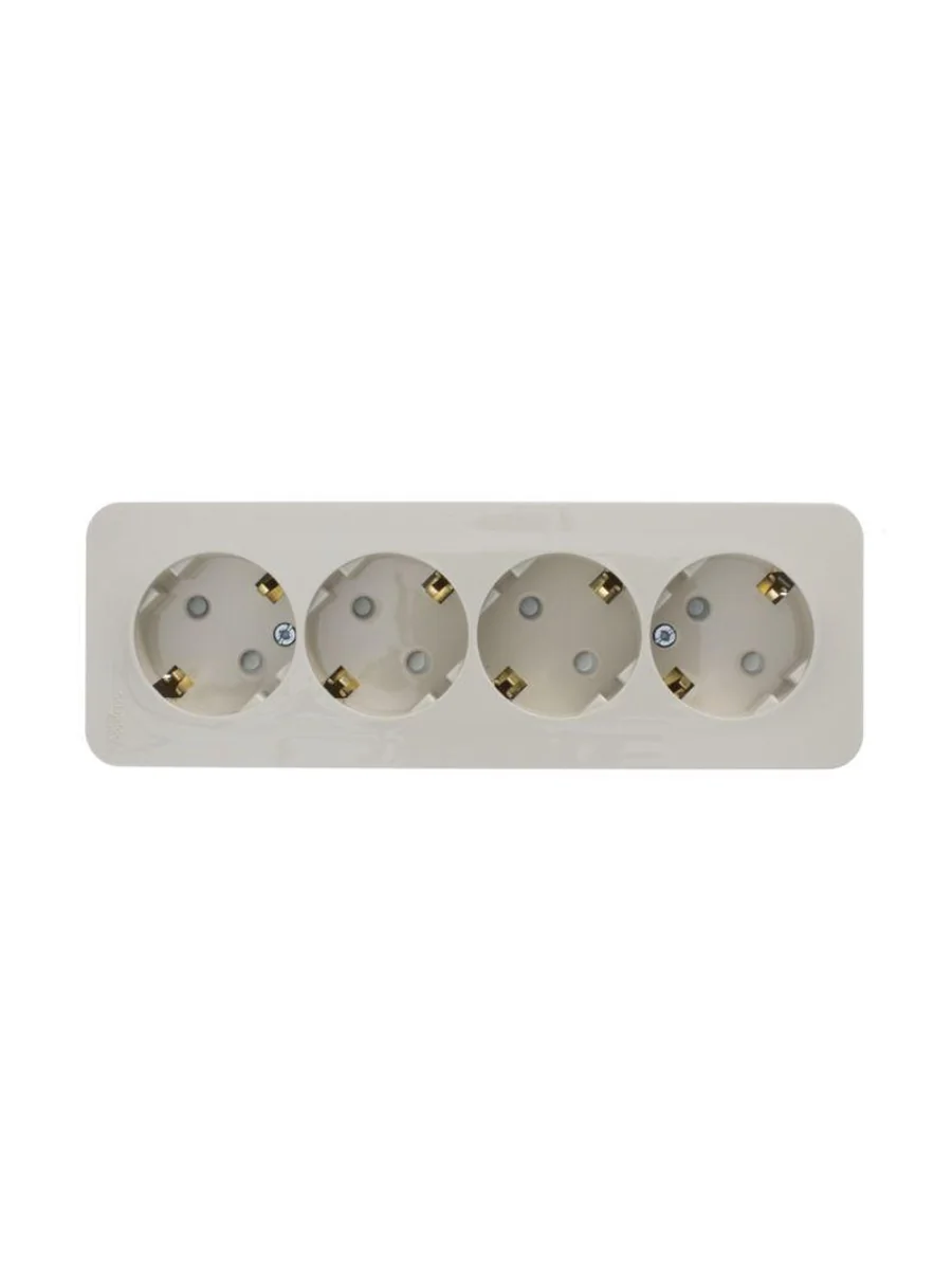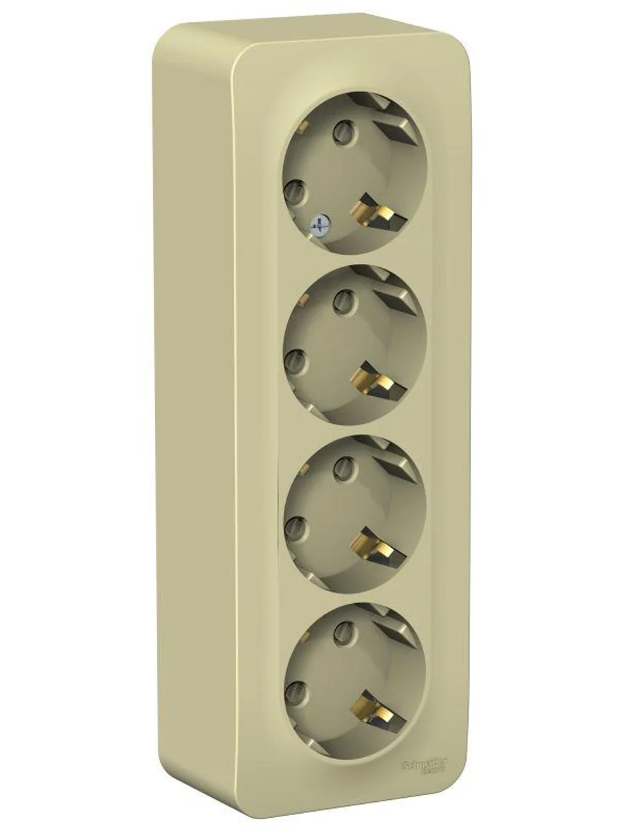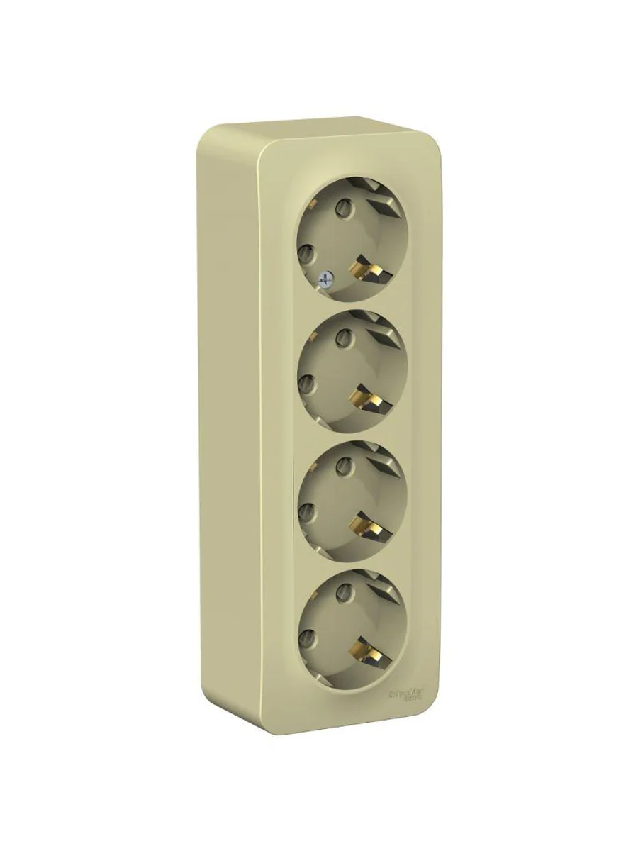 Розетка Systeme Electric (ранее Schneider Electric) BLANCA (открытой установки, цвет бежевый) четырёхместная с заземлением и шторками, с изолирующей пластиной подходит для сетей 250 В, на ток 16 А. Заземляющий контакт обеспечивает дополнительную защиту от удара электрическим током. При наличии заземления электрический потенциал уходит в землю, защищая человека. Входные отверстия расположены под углом 45 градусов, благодаря чему можно подключить несколько устройств: вилки и адаптеры не будут мешать друг другу. Корпус изделия выполнен из ABS-пластика.