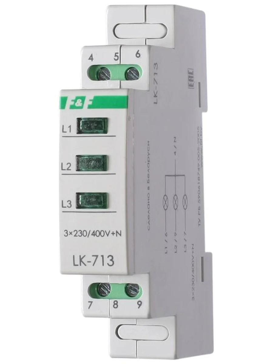 Указатель напряжения LK-713 3 зел. светодиода (сигнализация наличия 3ф 35мм 3х400/230+N IP20 монтаж на DIN-рейке) F&F EA04.007.002