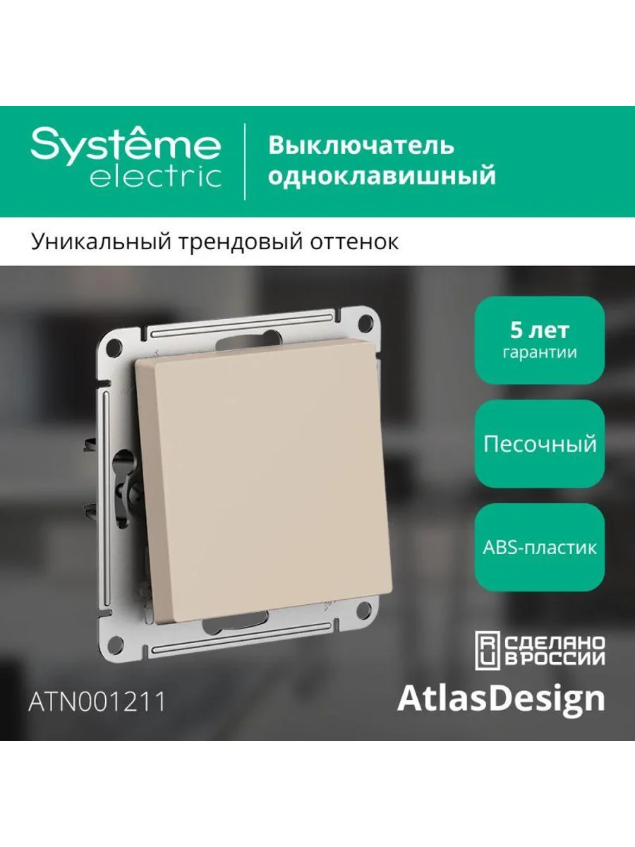 Механизм Systeme Electric (ранее Schneider Electric) серии AtlasDesign в цвете песочный выключателя 1-клавишного подходит для сетей 250 В, на ток 10 А. Лицевые детали из качественного ABS-пластика, устойчивого к царапинам и УФ-излучению. Усиленные прямые монтажные лапки для лучшей фиксации механизма в монтажной коробке.