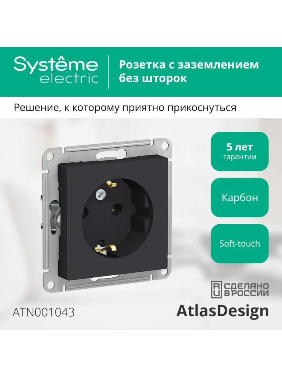 Механизм Systeme Electric (ранее Schneider Electric) серии AtlasDesign в цвете карбон розетки одинарной с заземлением и без шторок подходит для сетей 250 В, на ток 16 А. Заземляющий контакт обеспечивает дополнительную защиту от удара электрическим током. При наличии заземления электрический потенциал уходит в землю, защищая человека. Лицевые детали из качественного ABS-пластика, устойчивого к царапинам и УФ-излучению. Благодаря покрытию «soft touch» к изделию приятно прикасаться.