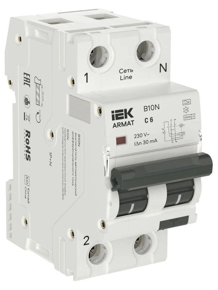 Автоматические выключатели дифференциального тока (АВДТ) ARMAT серии B10N с топологией полюсов 1P+N - надежное решение для промышленности, энергетики и бытового применения. Номинальная наибольшая отключающая способность 10 кА гарантирует надежную работу устройства даже при высоких токах короткого замыкания. Топология полюсов B10N 1P+N означает, что функции защиты от токов перегрузки и короткого замыкания, а также дугогасительная ферромагнитная решетка реализованы в фазном полюсе. Независимый механизм свободного расцепления с мгновенной коммутацией обеспечивает безопасное включение, а защитная шторка вывода исключает неправильное подключение и ошибку при монтаже проводников. Подключение шинами PIN и FORK реализовано сверху и снизу устройства. B10N 1P+N позволяет присоединять любые дополнительные модульный устройства ARMAT серии AUX (дополнительные контакты и расцепители), а также поворотную рукоятку типа RHN, блокировку рукоятки взвода типа HLC и заглушку вывода пломбировочную типа OTL. Модельный ряд включает в себя устройства с номинальными токами от 6 А до 63 А, с характеристиками срабатывания по сверхтоку B и C, типом защитной характеристики по дифференциальному току A, с номинальными дифференциальными токами отключения 30, 100, 300 мА.