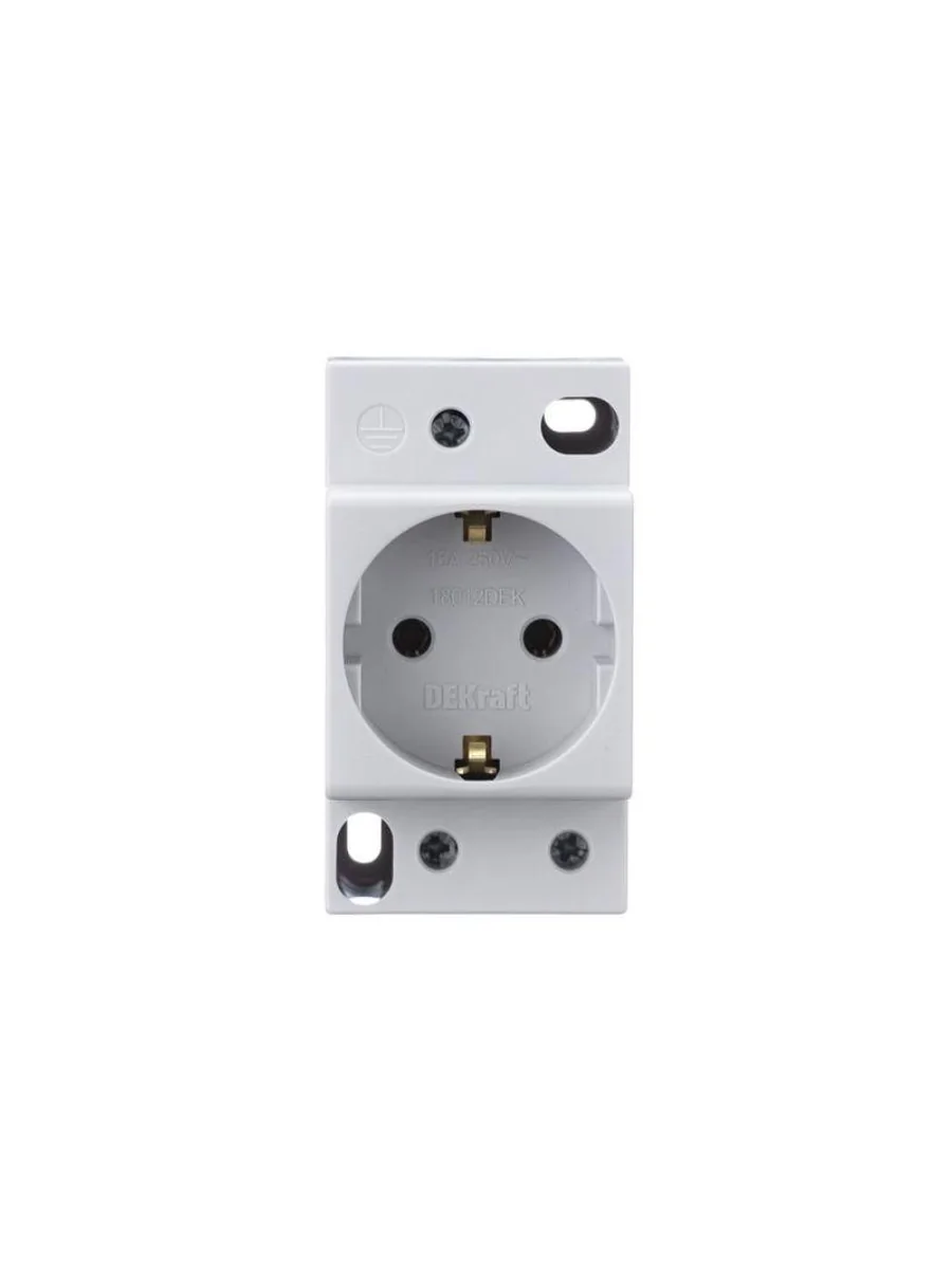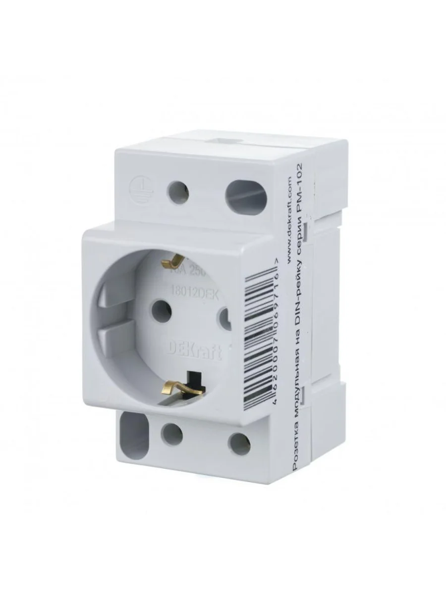 Розетка модульная серии РМ-102 Dekraft; ном.ток – 16 А; с заземляющим контактом; ширина – 45 мм; установка – на DIN-рейку; установочное положение – любое; степень защиты – IP20. Розетка модульные предназначены служит для подключения переносных светильников или электрического инструмента малой мощности во время профилактических и ремонтных работ в электрической сборке по месту установки.