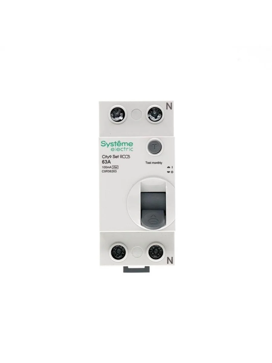 Выключатель дифференциального тока (ВДТ) или устройство защитного отключения (УЗО) серии City9 Set Systeme Electric, 2-полюсный, номинальный ток 63А, ток утечки 100 мА, тип АС, электромеханический. Применяется в электрических сетях напряжением 230В. Уставка по току утечки 100 мА обеспечивает гарантированную защиту людей при прямом и косвенном прикосновении. Кнопка тест обеспечивает проверку работоспособности аппарата. Крепление на DIN-рейку шириной 35 мм. Подключение сверху и снизу. Безопасные клеммы (ранее Schneider Electric EZ9R54263, R9R52263).