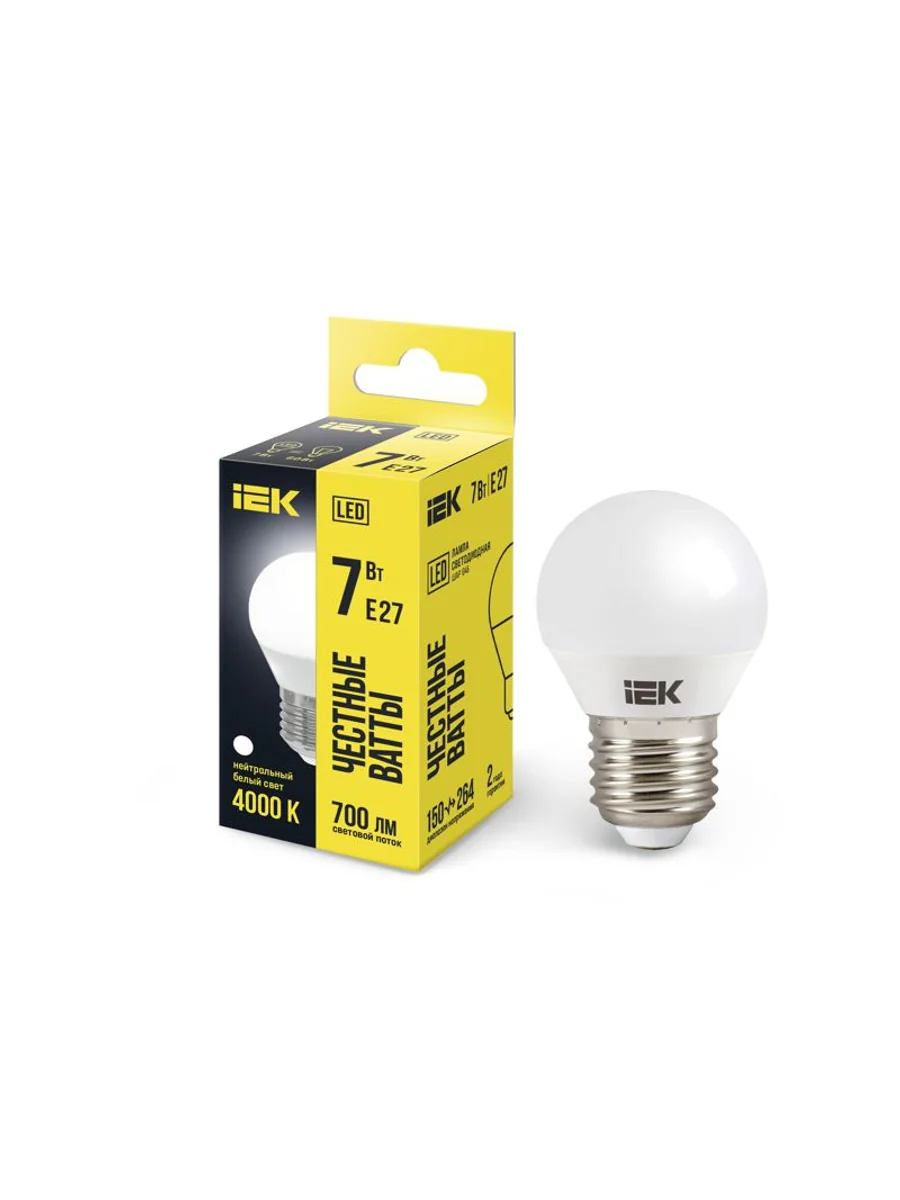 Лампа LED G45 шар 7Вт 230В 4000К E27 IEK. Светодиодные лампы предназначены для использования в осветительных приборах наружного и внутреннего освещения объектов промышленного, коммерческого и бытового назначения. Соответствуют требованиям Технических регламентов Таможенного союза ТР ТС 004/2011, ТР ТС 020/2011, МЭК 62560, Постановления Правительства РФ от 10.11.2017 № 1356.