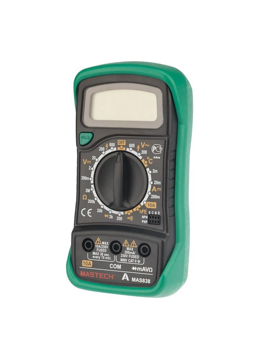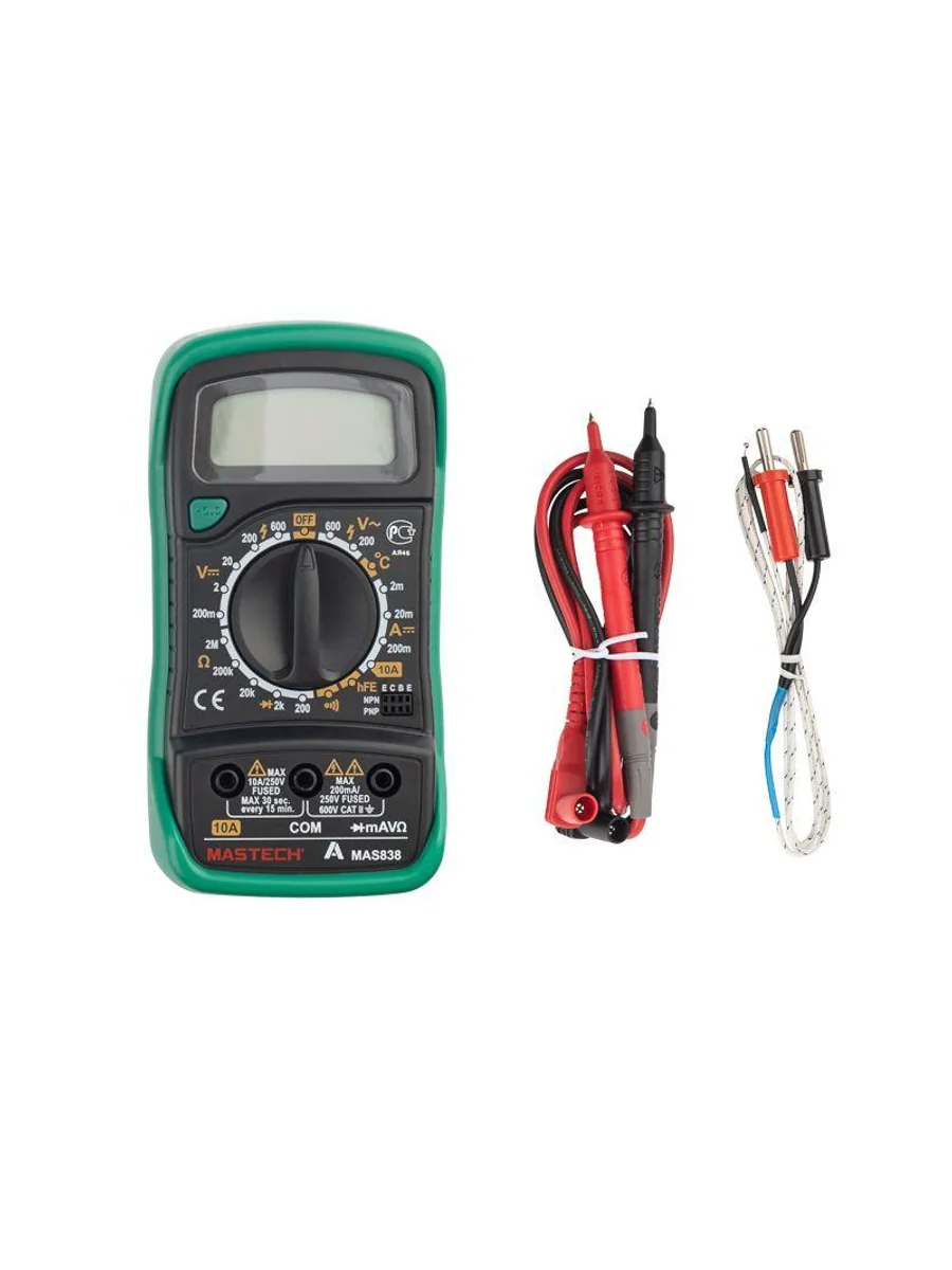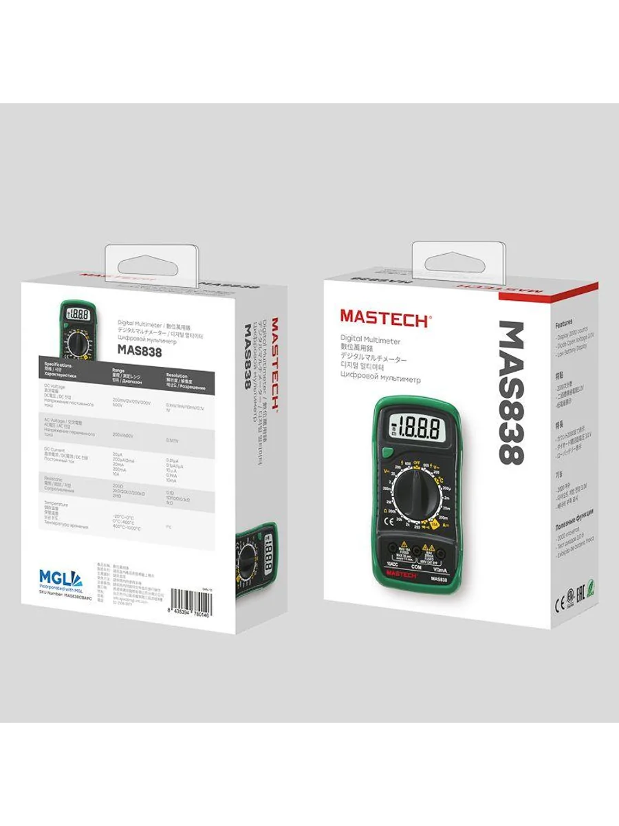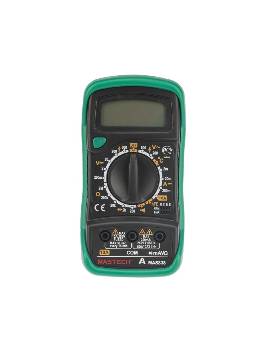 Портативный мультиметр MASTECH MAS838 – прибор, который измеряет постоянное и переменное напряжение, постоянный ток, сопротивление в цепи, температуру. С помощью данного устройства можно проводить тестирование диодов и прозвонку целостности цепи. Прибор оснащен функцией удержания результата измерений DATA HOLD: используется в случае проведения работ в труднодоступных местах. Поворотный регулятор для выбора измеряемых величин и их пределов усилен для исключения возможности случайного нажатия. Мультиметр укомплектован термопарой «К»-типа, измерительными щупами, батареей и руководством по эксплуатации. Прибор изготовлен из высококачественных материалов, калибровка и тестирование приборов произведены под контролем компании СДС. Характеристики: Постоянное напряжение: 200 mВ/2 В/20 м/200 В (±0.5% +3), 600 В (±0.8% +5) Переменное напряжение: 200 В/600 В (±1.2% +10) Постоянный ток: 20 мкА/200 мкА/2 мА/20 мА/200 мА (±1.0% +3), 10 A (±3.0% +10) Сопротивление: 200 Ом/2 КОм/20 КОм/200 КОм (±0,8% +2), 2 МОм (±1,0% +5) Температура: –20...+1000 °С (±2.0% +2) Тестирование диодов: да Прозвонка целостности цепи: да Импеданс: <50 Ом Рабочая температура: 0...+40 °С Размер: 138х69х31 мм Тип батареи: 9 В «Крона» Принадлежности: устройство, комплект измерительных щупов, батарея 9 В, термопара «К»-типа, инструкция и упаковка Преимущества: Режим удержания измерений DATA HOLD Индикация разряда батареи Ручной выбор предела измерений 4-разрядный дисплей Небольшой вес